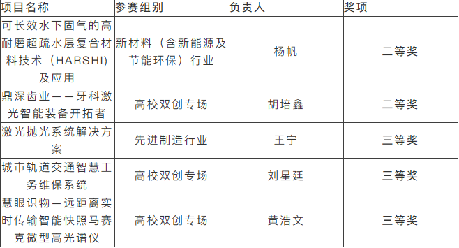 “可长效水下固气的高耐磨超疏水层复合材料技术(HARSHI)及应用”、“鼎深齿业——牙科激光智能装备开拓者”均为赛道第二名。