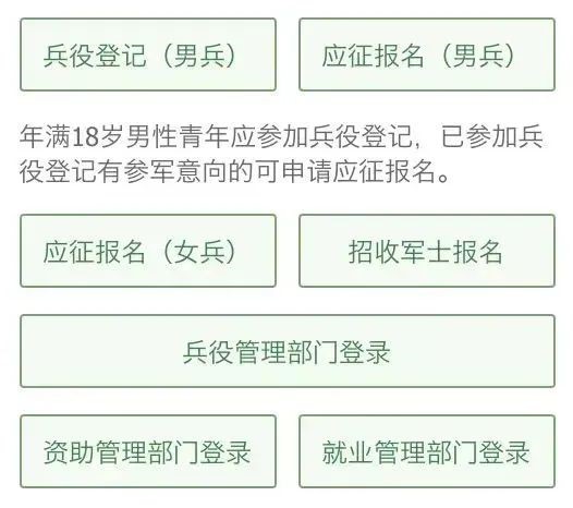 2、如果你还没有进行兵役登记,请点击“兵役登记(男兵)”进入页面;否则就从“应征报名(男兵)”进入页面。
