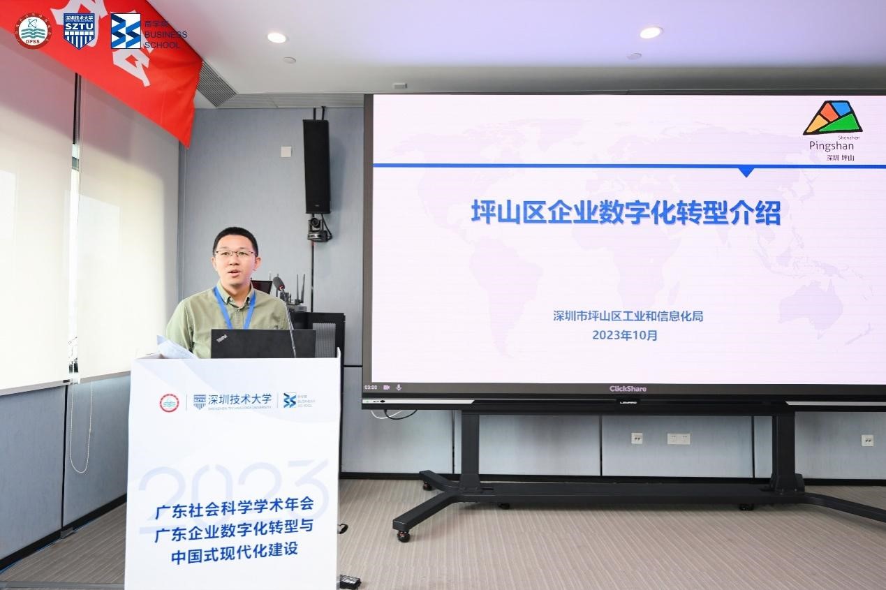 深圳市坪山区工业和信息化局党组成员、副局长余敏强作“坪山企业数字化转型介绍”主题演讲,他从坪山概况、经济数据、“20+8”产业发展、坪山产业发展等方面阐述坪山产业现状,从强化产业政策引导、搭建工业互联网公共服务平台、开展数字化转型、树立数字化转型标杆示范等方面介绍了坪山区数字化转型新思路。