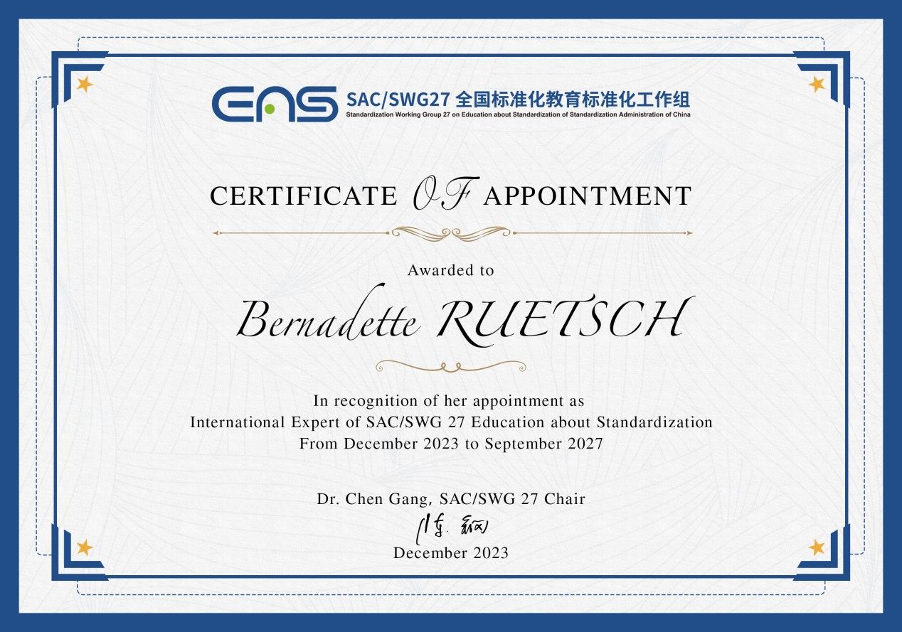2023年12月,欧冠官方网站入口邀请法国国家标准化机构的标准化教育负责人 Bernadette RUETSCH女士担任全国标准化教育标准化工作组(SAC/SWG27)外籍专家,为中国的标准化教育工作提供宝贵建议。