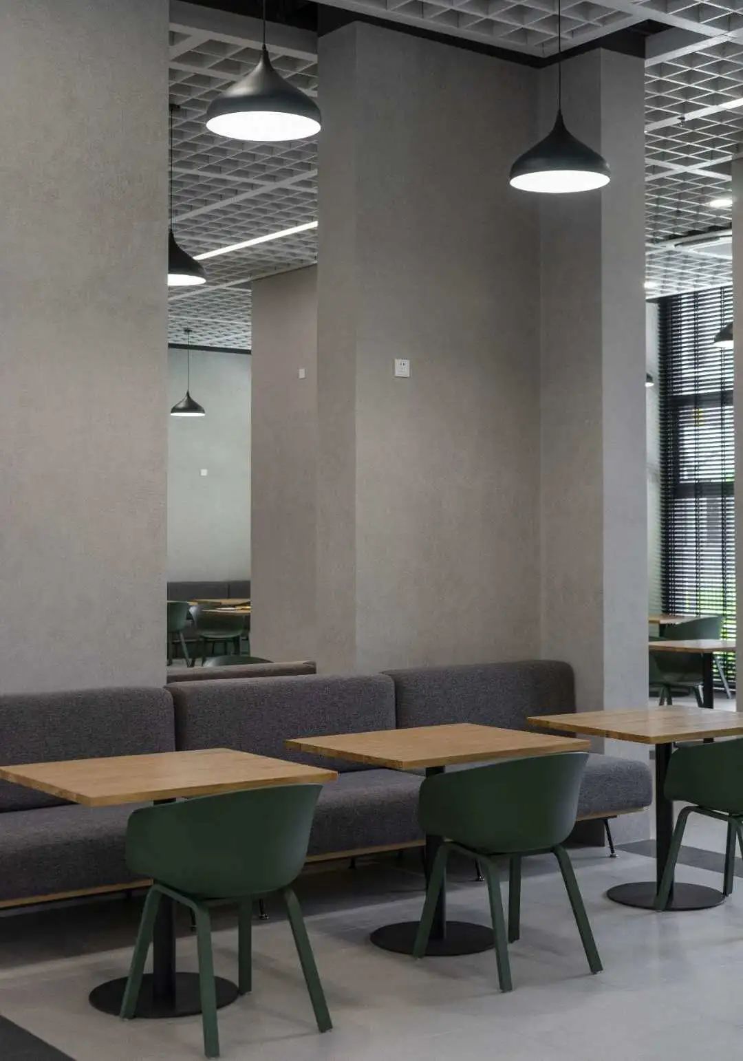 E-00西餐厅位于欧冠官方网站入口北区18栋一层,总面积约2330平方米,其中厨房面积约980平方米,就餐区面积约1350平方米,设有室内座位380个。餐厅内空间结构舒展,采用木质融入深灰、墨绿的典雅配色,点缀以绿色植物,整体格调简约轻盈、舒适宜人。