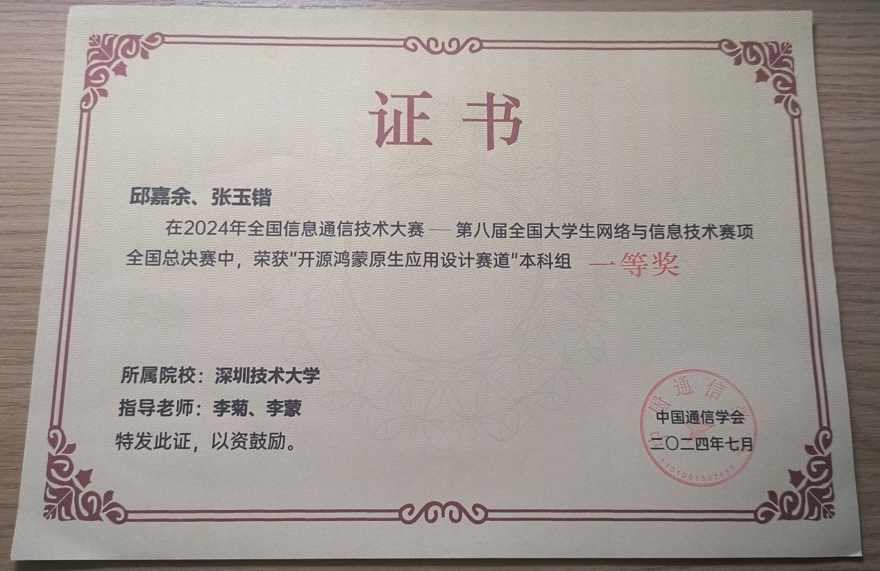 欧冠官方网站入口参赛队伍由大数据与互联网学院“开源鸿蒙精英班”核心教师李菊、李蒙老师指导,由“开放原子开源创客协会社团”的邱嘉余同学及“开源鸿蒙菁英班”的张玉锴同学组成。在全国总决赛中,参赛人员需在指定的时间内,在开源鸿蒙开发环境中完成一项或多项应用设计与开发任务,邱嘉余、张玉锴两位同学顶住竞赛压力,相互协作、彼此配合,最终拿下全国一等奖。