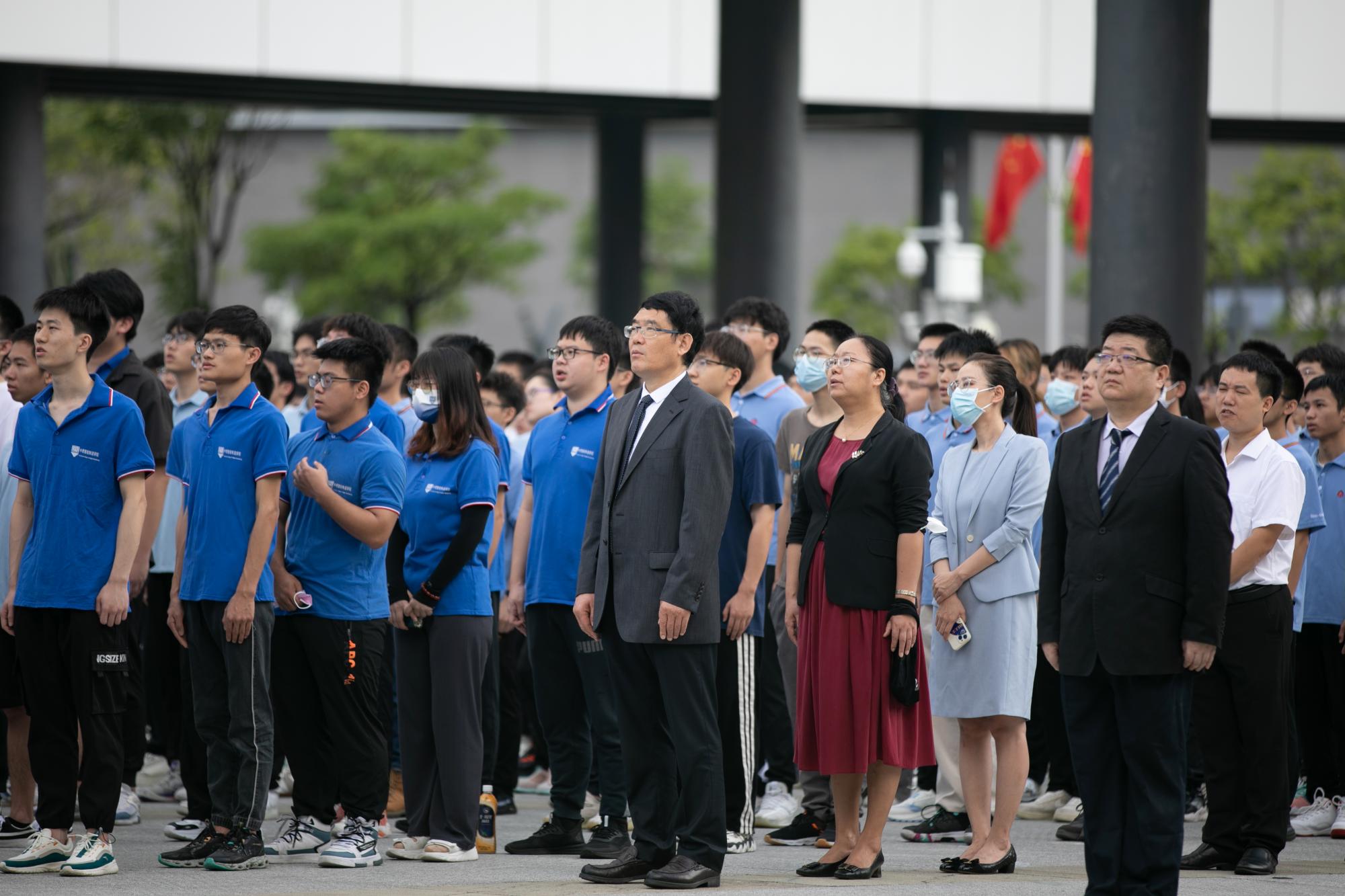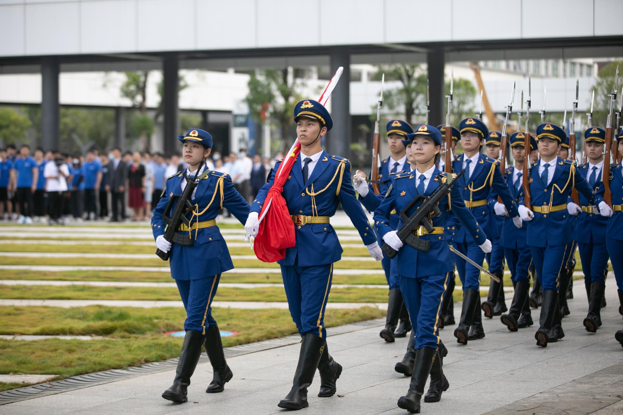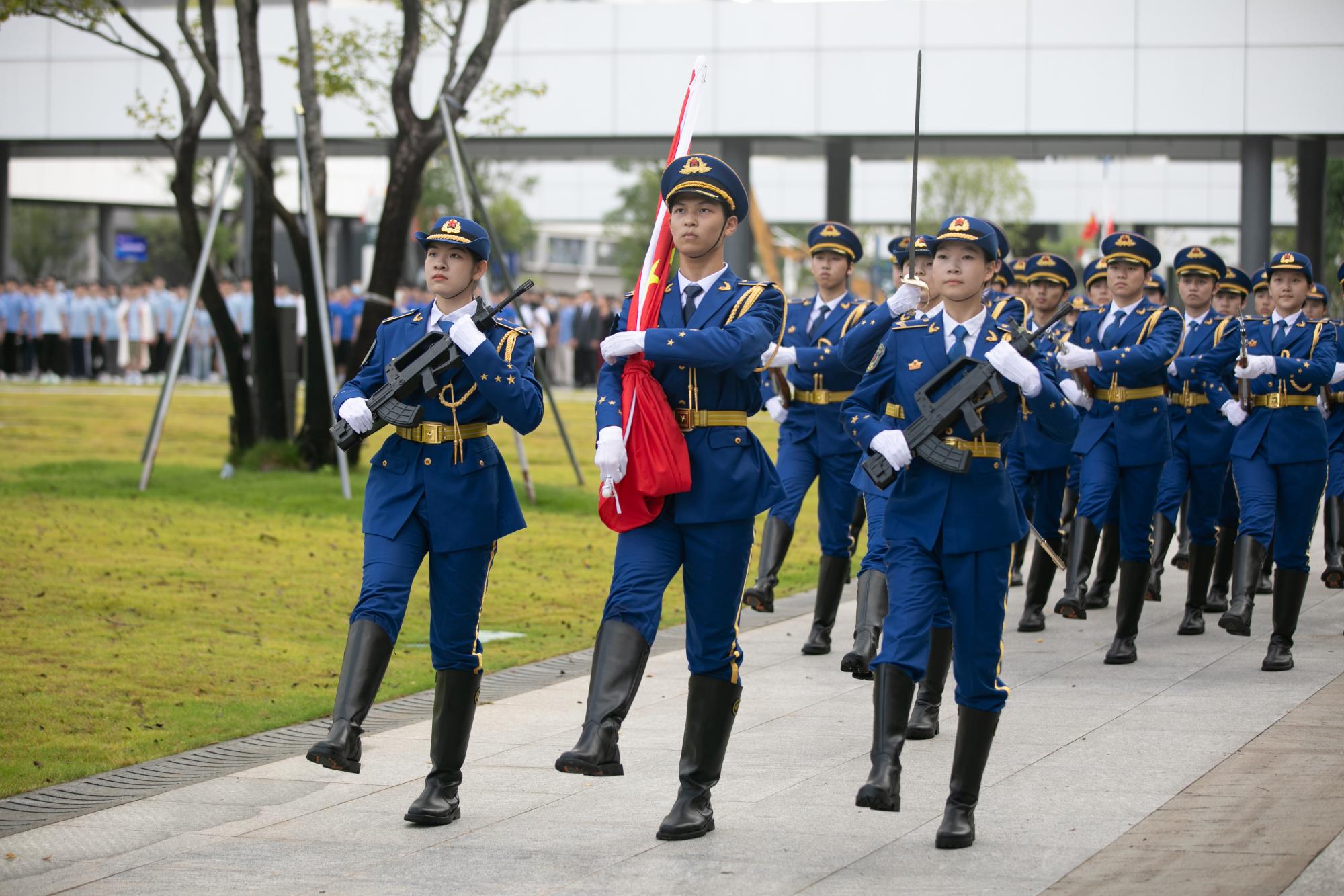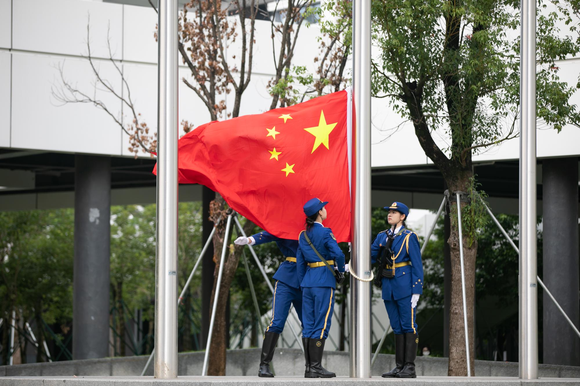 8时整,深技大国旗护卫队队员迈着铿锵有力的步伐,护送国旗走向升旗台。伴随着《义勇军进行曲》奏响,五星红旗冉冉升起,现场师生高唱国歌,向国旗行注目礼。