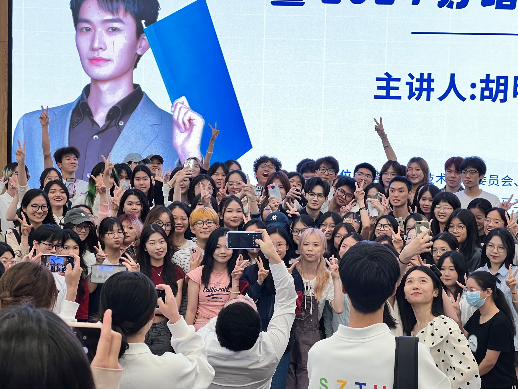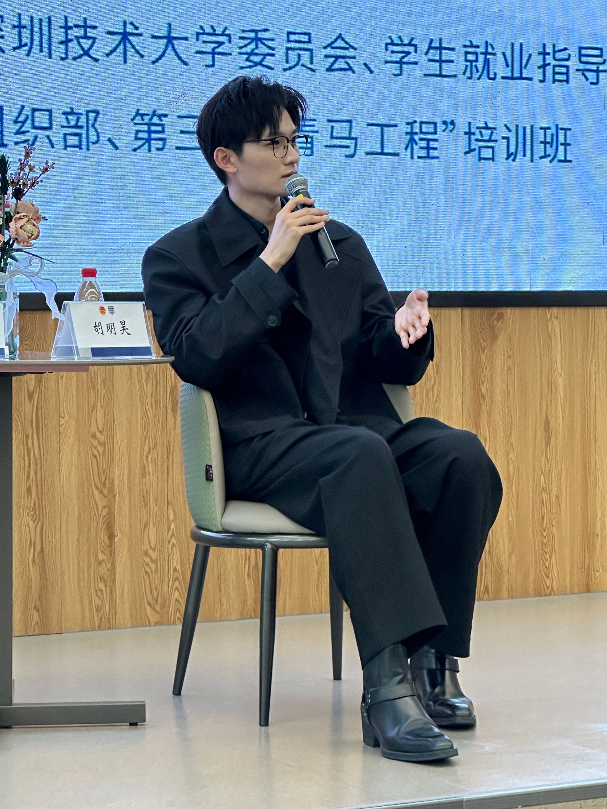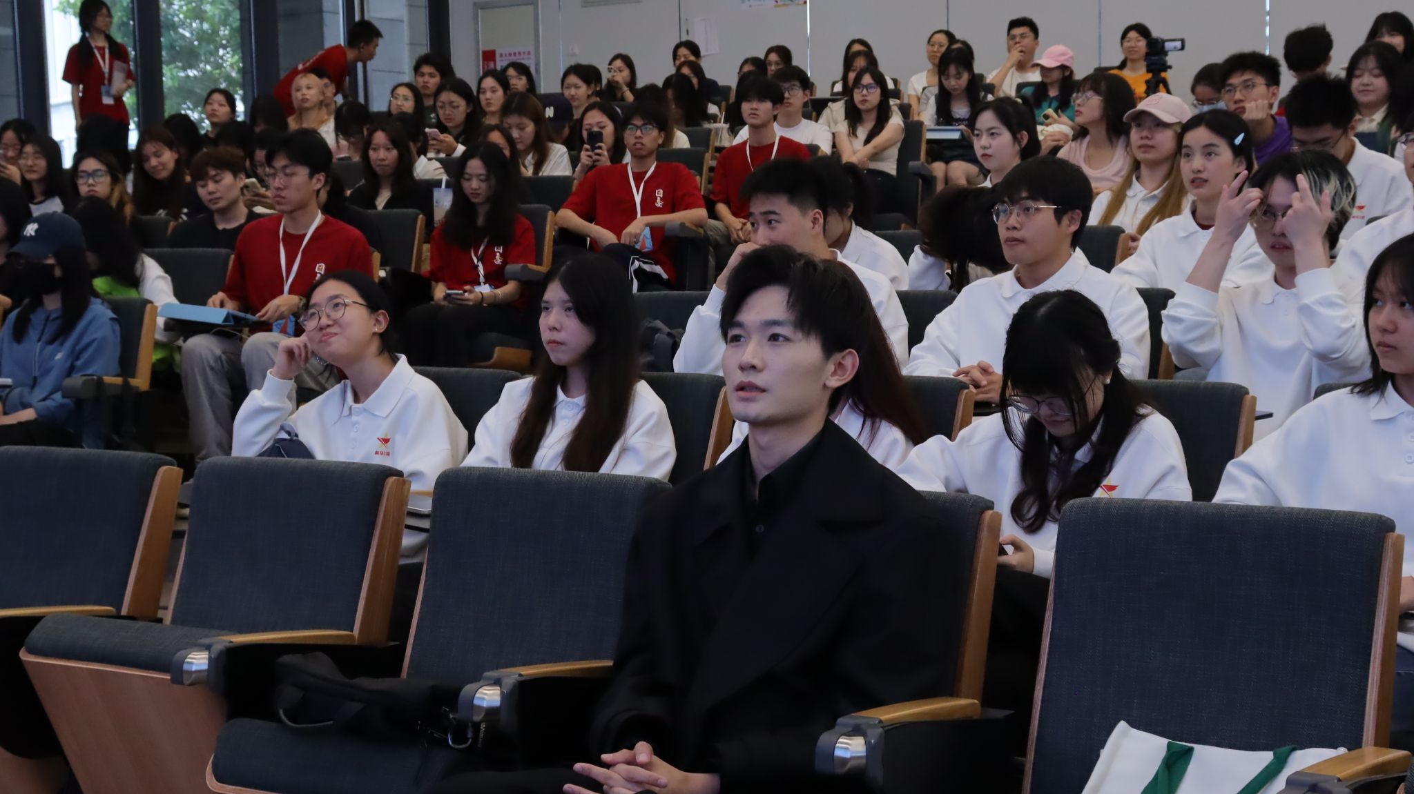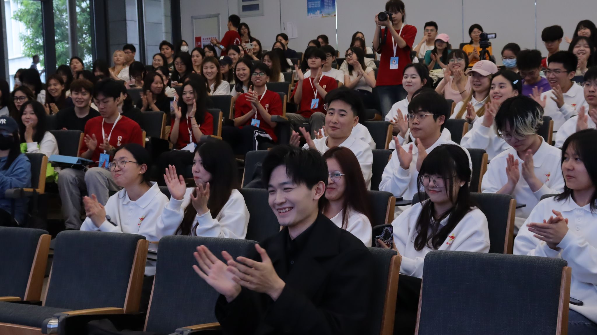 活动中,胡明昊围绕个人成长过程、大学生活、求职实习经历等方面作经验分享。在讲述成长经历时,他以参与播音主持训练为例,鼓励大家不要害怕“丢脸”,要抓住机会勇敢表达,培养一个强大的内心。在谈到大学生活时,他认为在学习之余尽可能多参加如“挑战杯”竞赛或其他第二课堂的活动是很重要的。“做的比别人多,你才能收获比其他人更多的东西。”他这样说。