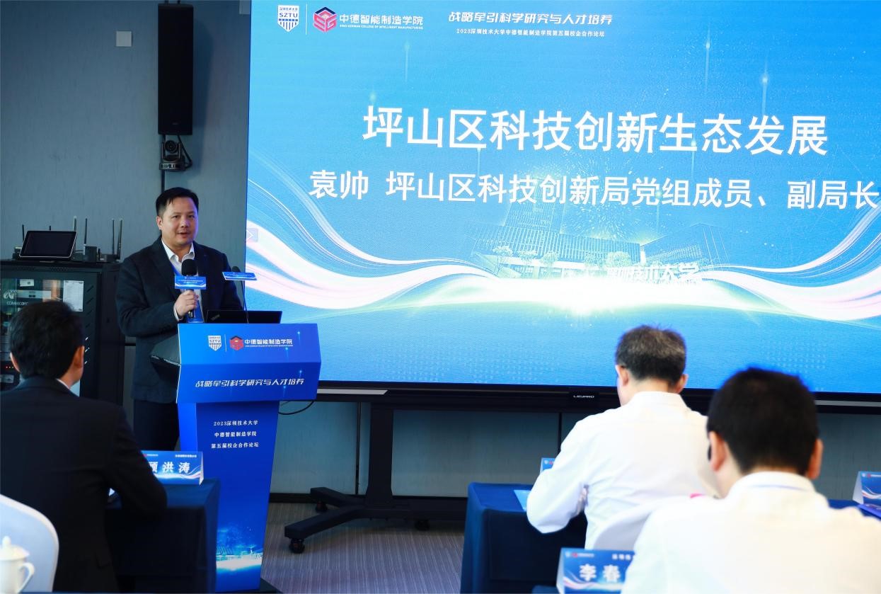 坪山区科技创新局党组成员、副局长袁帅作主题致辞,希望进一步加强产、学、研、资、政等各方联动,在科技创新、人才培育、空间保障体制和机制等方面创新探索,共同促进产学研深度融合。