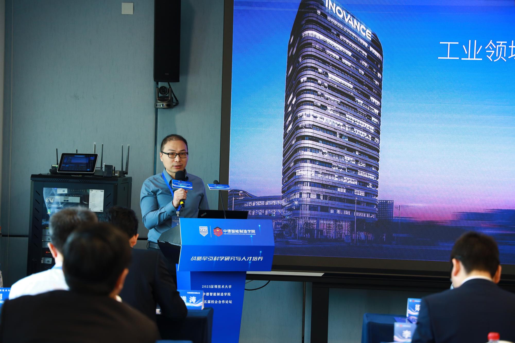 深技大科研与校企合作部主任吴旭详细介绍了学校在产教融合、校企合作以及科研成果等方面内容,号召广大企业携手同行、共创未来。深技大中德智能制造学院院长张文伟介绍分享了中德学院在科研实力、校企合作等方面的情况。比亚迪、汇川技术等企业相关负责人则现场作自身企业发展报告,详细介绍其企业在人才培育、产业融合等方面的创新做法和经验。