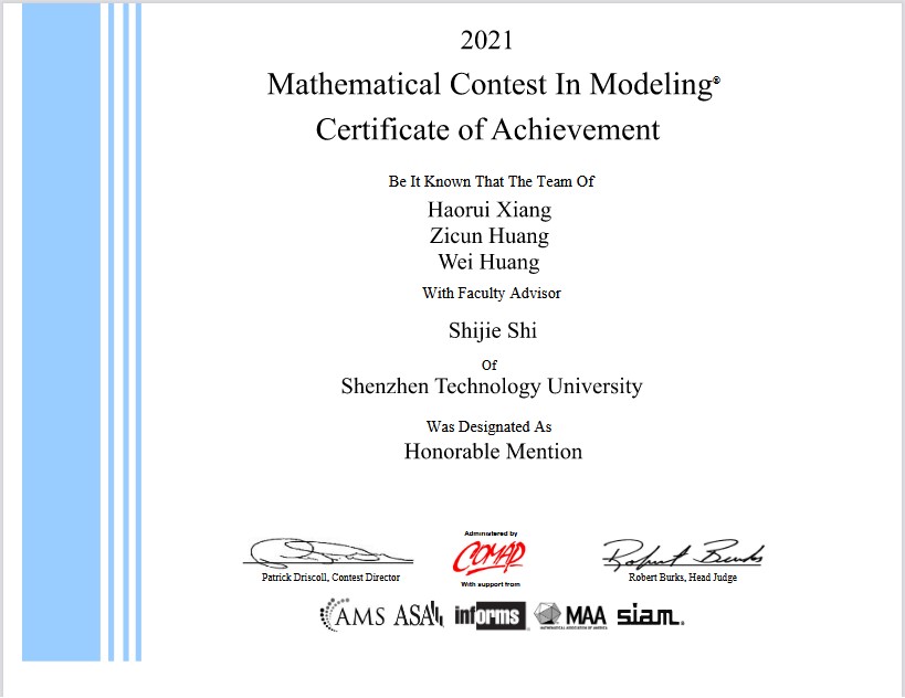 近日,2021年美国大学生数学建模竞赛和交叉学科建模竞赛(MCM/ICM)成绩揭晓,深技大大数据与互联网学院参赛队伍在竞赛中获国际二等奖(Honorable Mention)2项,成功参赛奖(Successful Participant)8项。这也是深技大首次派出学生参加国际数学建模竞赛。