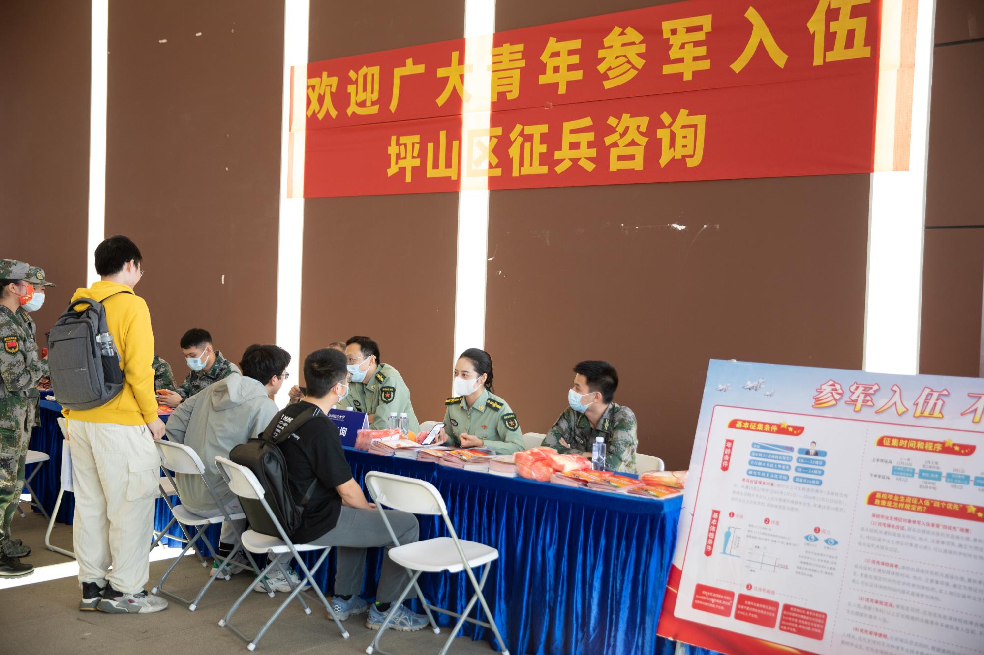 此外,双选会设有“征兵咨询区”,坪山区武装部及石井街道武装部工作人员现场为有应征入伍意愿的学生进行介绍与答疑,鼓励毕业生们为我国国防事业贡献力量。