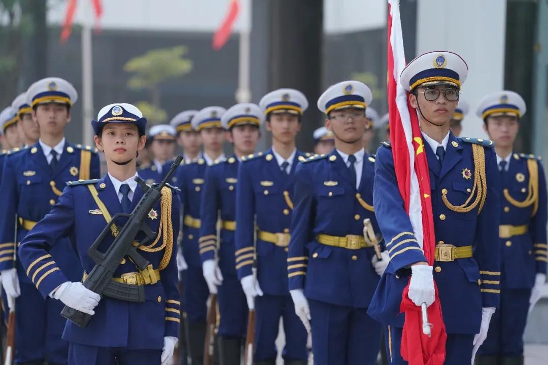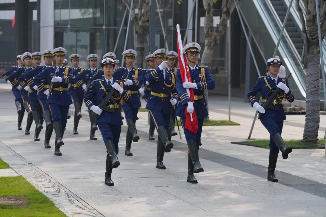 9时整,深技大国旗护卫队队员迈着铿锵有力的步伐,护送国旗走向升旗台。随着《义勇军进行曲》在校园广场内奏响,五星红旗冉冉升起,现场师生高唱国歌,向国旗行注目礼。