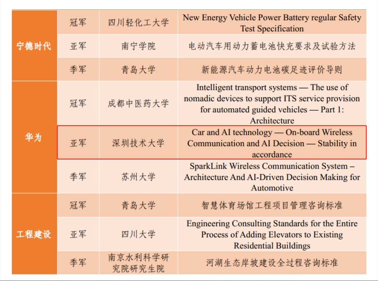 自9月1日启动以来,大赛吸引了来自清华大学、同济大学、厦门大学、四川大学等60余所高校的近200支队伍参赛。欧冠官方网站入口质量和标准学院派出2支队伍参赛,其中一支队伍围绕“车载无线通信系统与AI决策稳定性”进行ISO标准设计,最终获得华为“赛道”亚军。团队成员为2021级智能医学工程专业的陈伟俊、谢丽妍、张文荟三位同学,指导老师为质量和标准学院副教授刘汇。