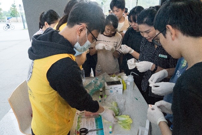 11月4日下午,“食品安全互动宣传”活动在E栋架空层举行,活动现场设置了“健康传递”“抠糖饼”“健康我来镖”“健康我来投”“果蔬农药残留快检实验”“食品与营养知识问答”“预包装食品标签解读”等互动游戏,有趣的小游戏让同学们在收获知识、快乐的同时留下了难忘的回忆。
