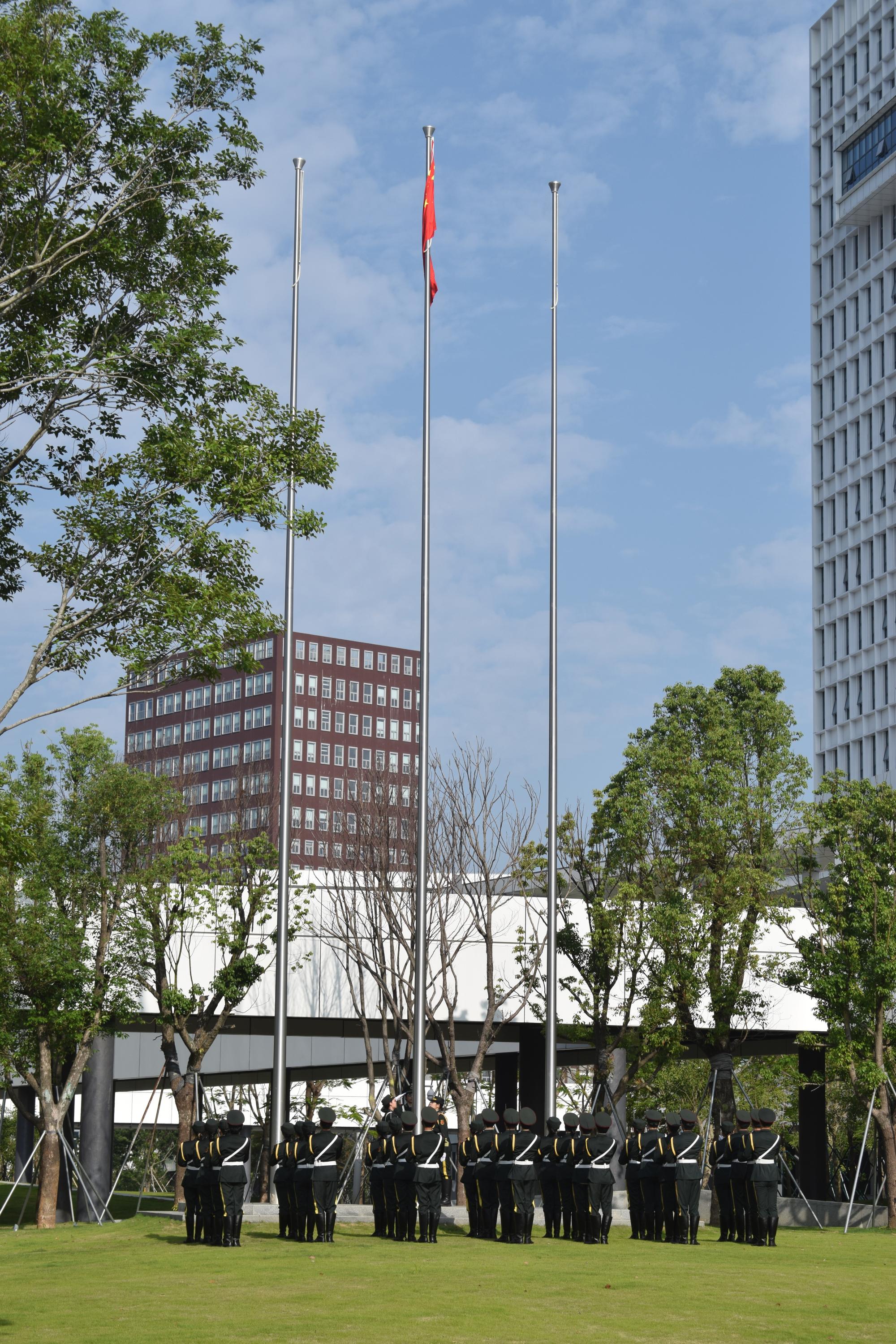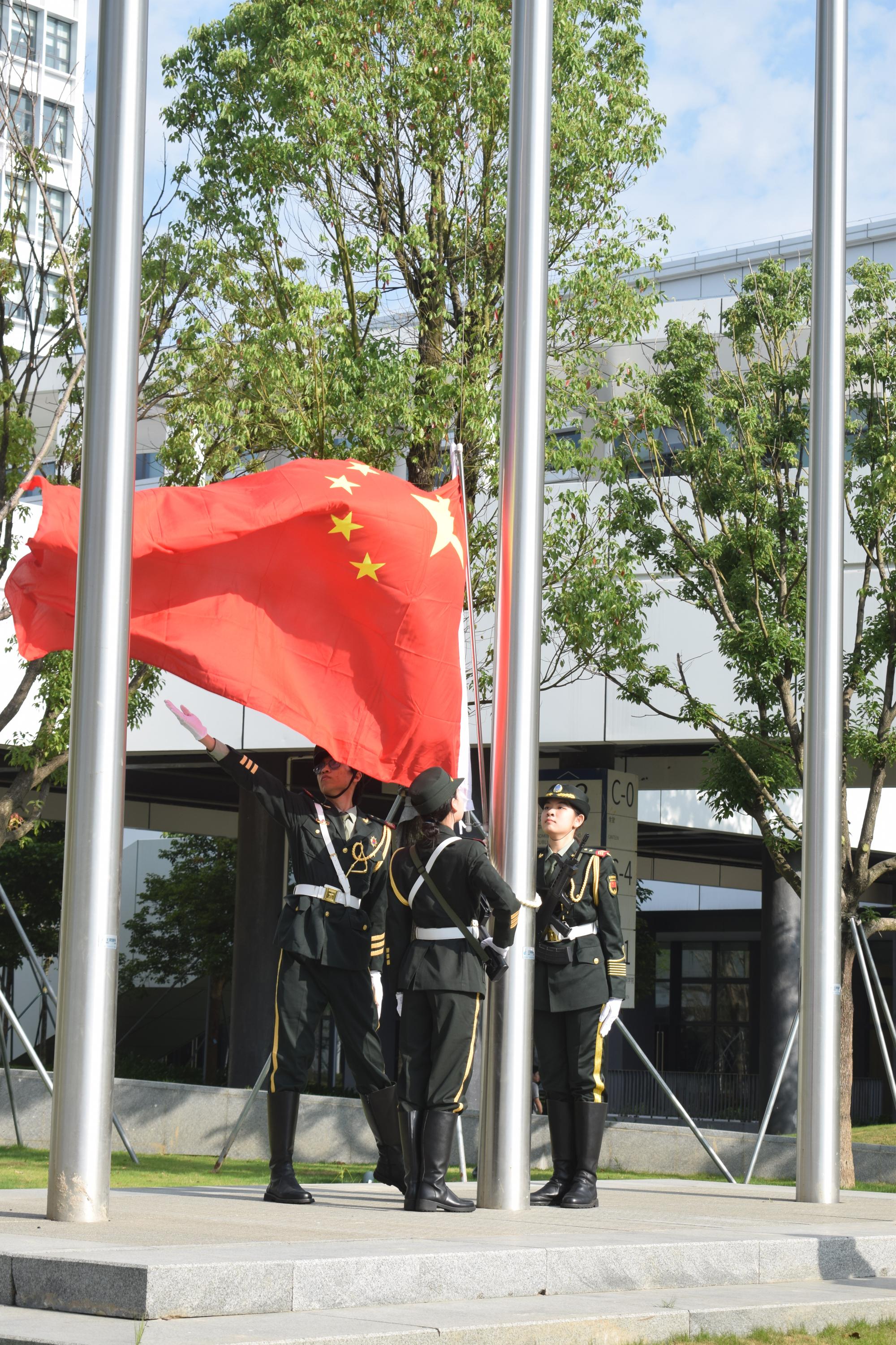国旗护卫队英姿飒爽,五星红旗迎风招展!全体师生肃立向国旗行注目礼。伴随着激昂的《义勇军进行曲》,五星红旗冉冉升起,承载着新的希望,激励着新一代青年奋勇向前。
