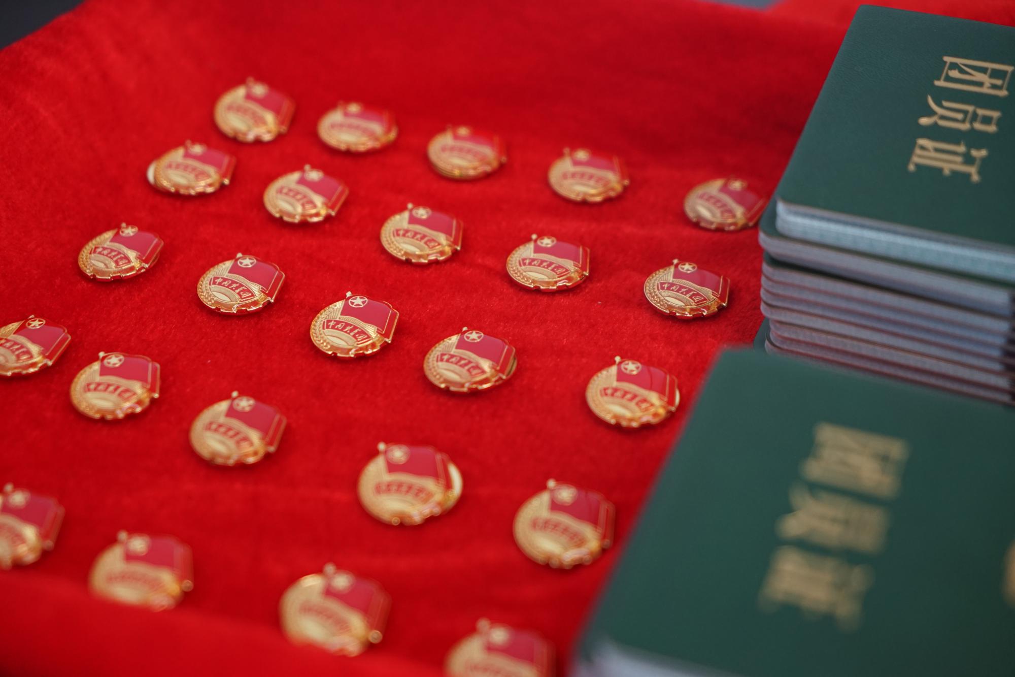 在新团员入团仪式上,校团委副书记尚莹莹为27位新团员颁发团章、团员证以及团徽。