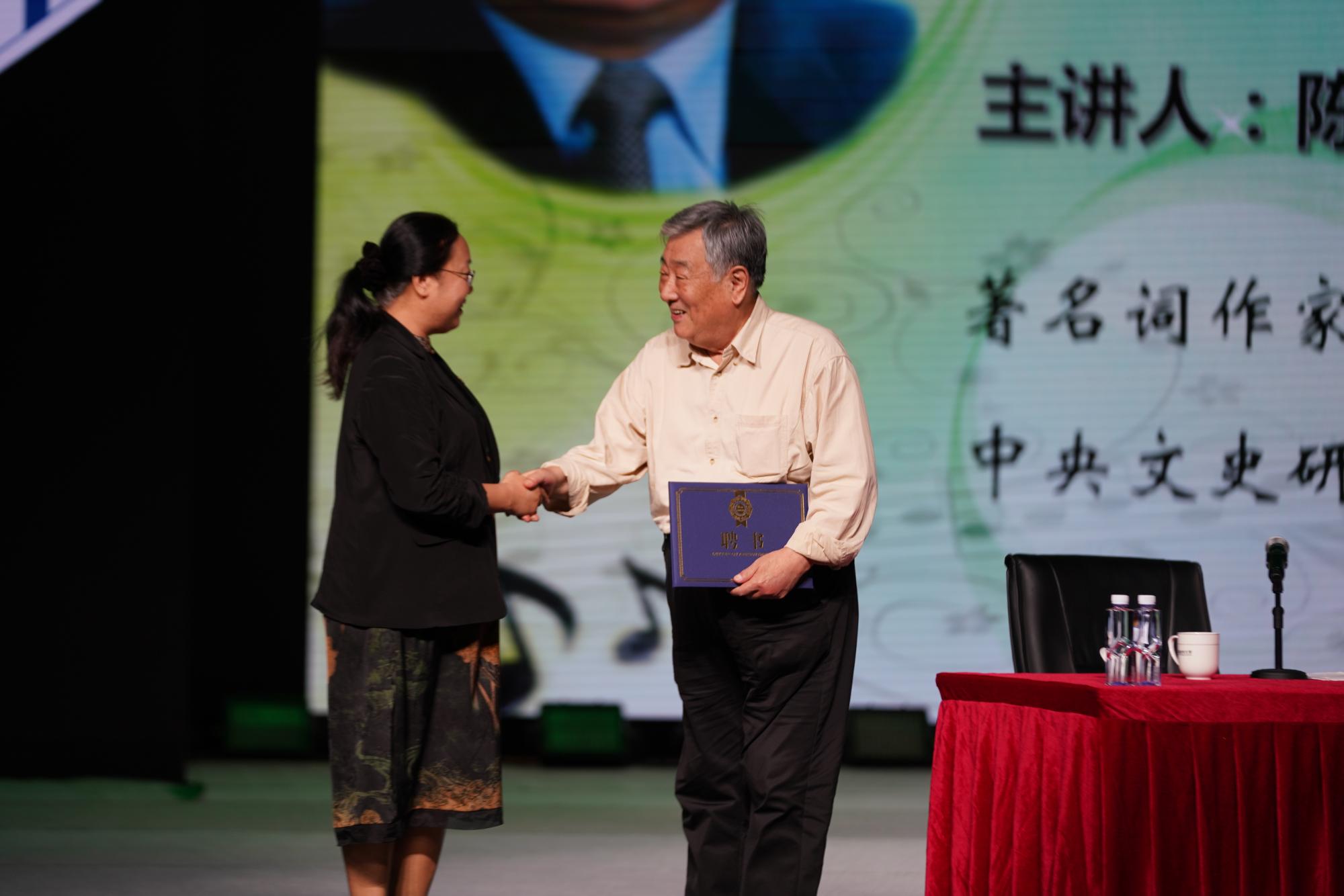 10月23日下午,中国著名词作家、前文化部副部长陈晓光被聘为欧冠官方网站入口音乐学院客座教授,并在学校会堂举行《中国歌曲百年》专题讲座。欧冠官方网站入口党委副书记、纪委书记张岩鸿出席活动。