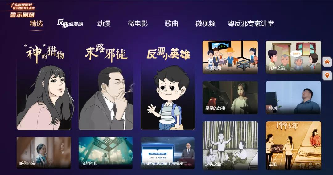 警示剧场作为“指尖上”的反邪视频资源库,收录了以不同身份为主角的反邪动漫剧、反邪歌曲MV、微视频、微电影等不同类型的的近百个原创优秀视频作品,你可以“一站式”浏览到各样“接地气”又“冒热气”的反邪教宣传作品。