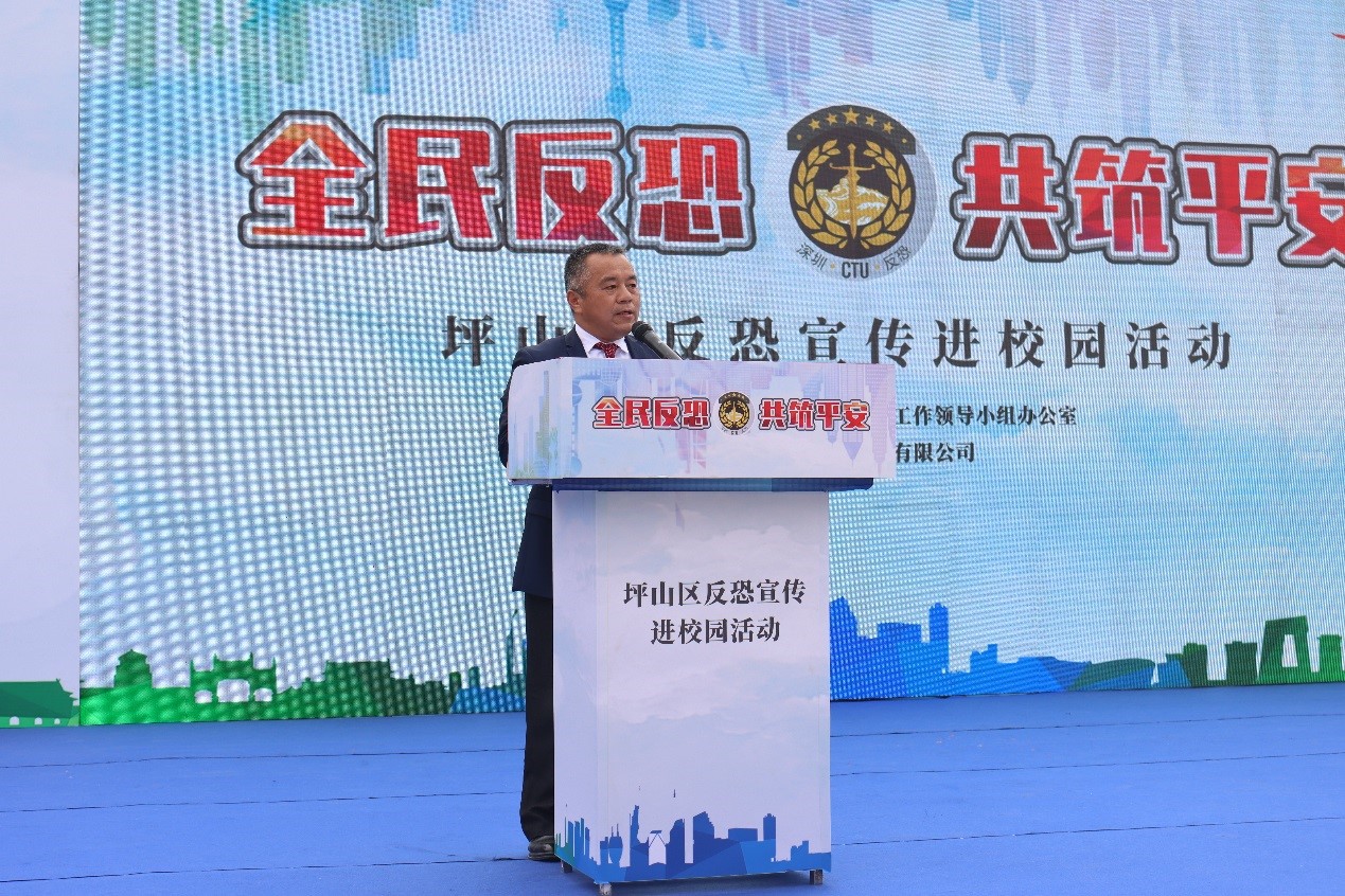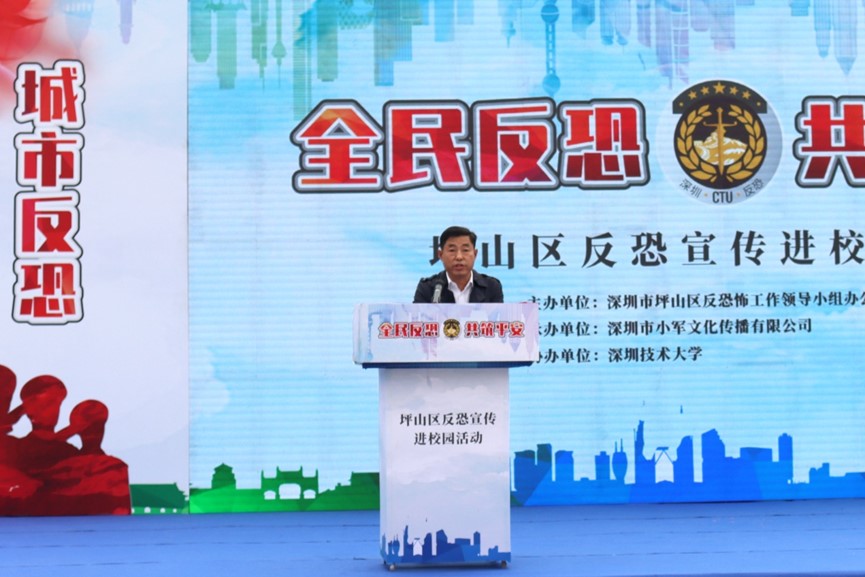 12月7日下午,我校联合坪山区反恐办举行“全民反恐 共筑平安”主题宣传教育活动。市反恐办大队长杨韬、区反恐办副主任赵勇、区教育局、区民宗局以及各派出所相关负责人出席,校团委、国际合作与学生工作部、安全保卫中心等相关部门工作人员参加了活动。
