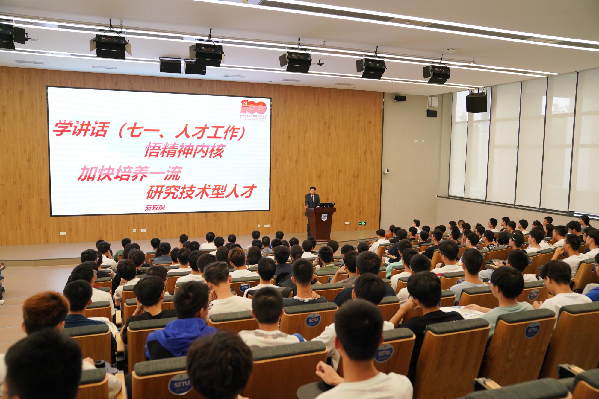 阮双琛紧紧围绕“为党育人、为国育才”这一主题,带领同学们回顾学习了习近平总书记“七一”重要讲话和习近平总书记在中央人才工作会议上的重要讲话精神,并从欧冠官方网站入口的使命与担当、高等教育发展三大趋势等方面深入讲解,讲座精彩、内涵丰富,现场不时传出阵阵掌声。