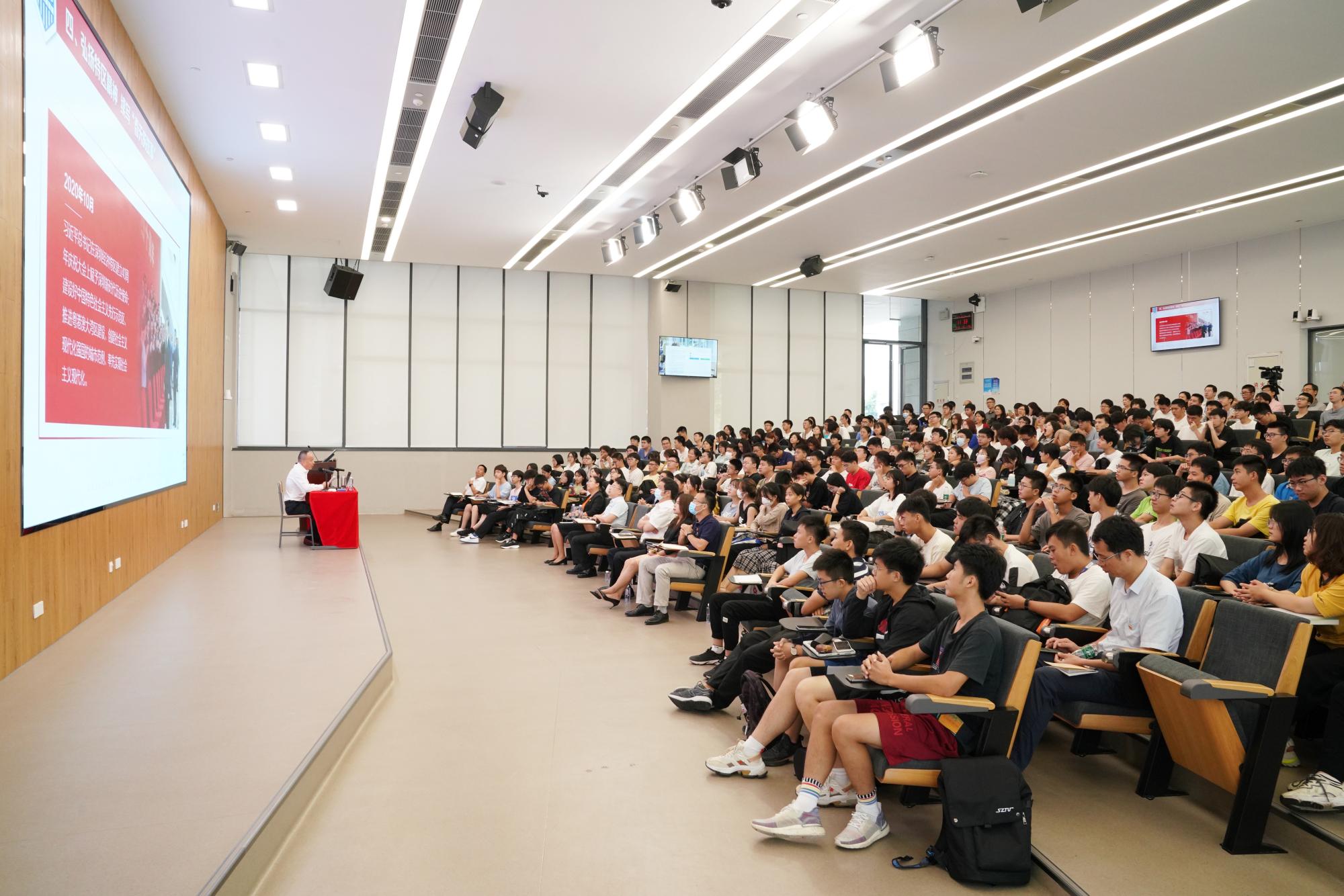 9月24日,欧冠官方网站入口党委书记张基宏为学校师生讲授题为《弘扬特区精神 锻造先锋力量 奋力建设中国一流应用型大学》的党史学习教育专题党课暨思政第一课。校党委副书记、纪委书记张岩鸿主持讲座。讲座以主会场与分会场相结合的方式举行,2021级1000余名新生,各单位党员代表、马克思主义学院教师、学校入党积极分子,市委教育工委党史学习教育第一巡回指导组相关负责同志现场聆听了讲座。