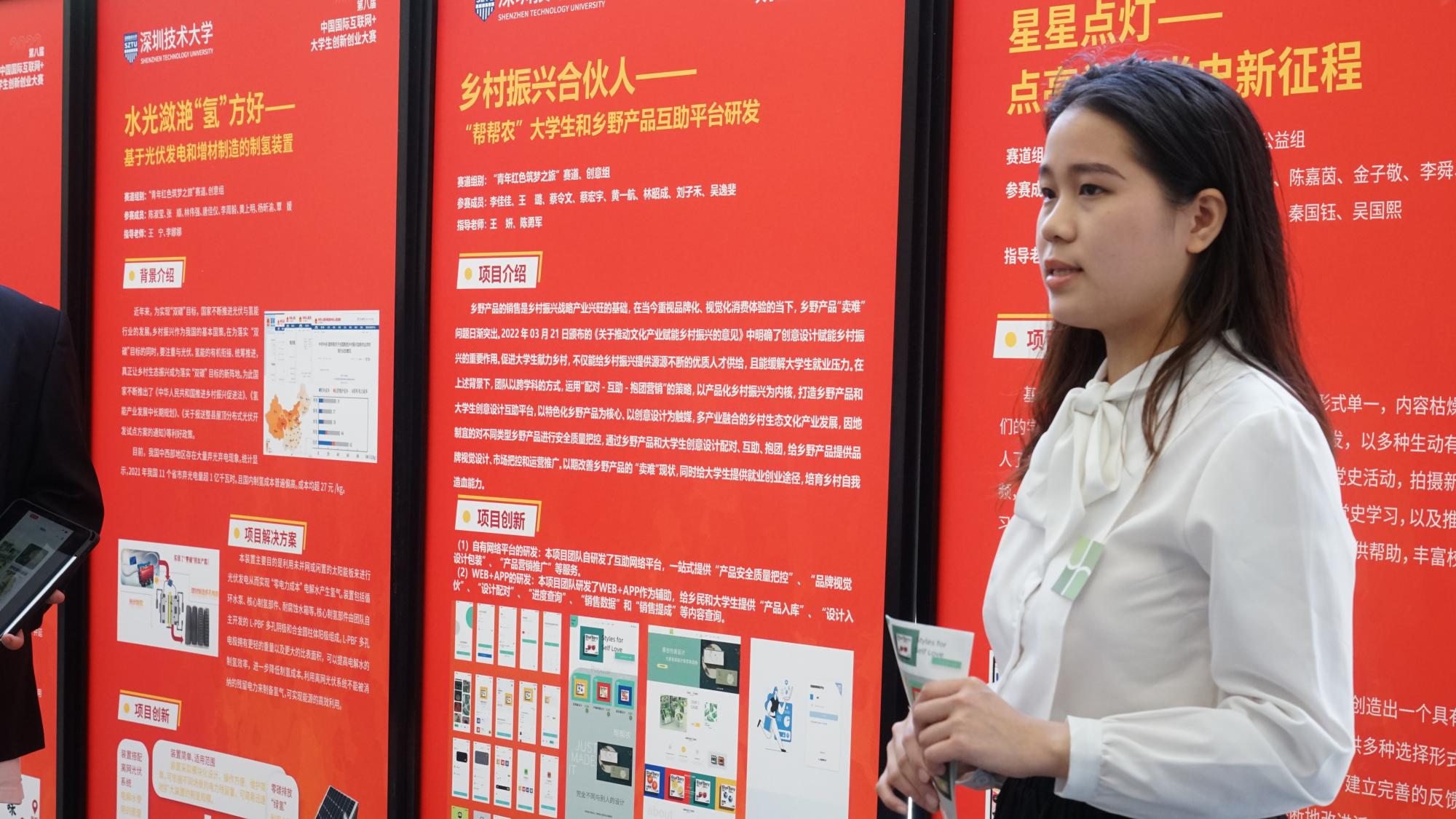 决赛分为上下午两个环节,32个项目的主要负责人在上午以3分钟极速路演的形式,使用活动现场的展板对项目进行展示,排名前16名的项目进入到下午的路演答辩环节,经过评委现场打分点评,评选出最终结果。