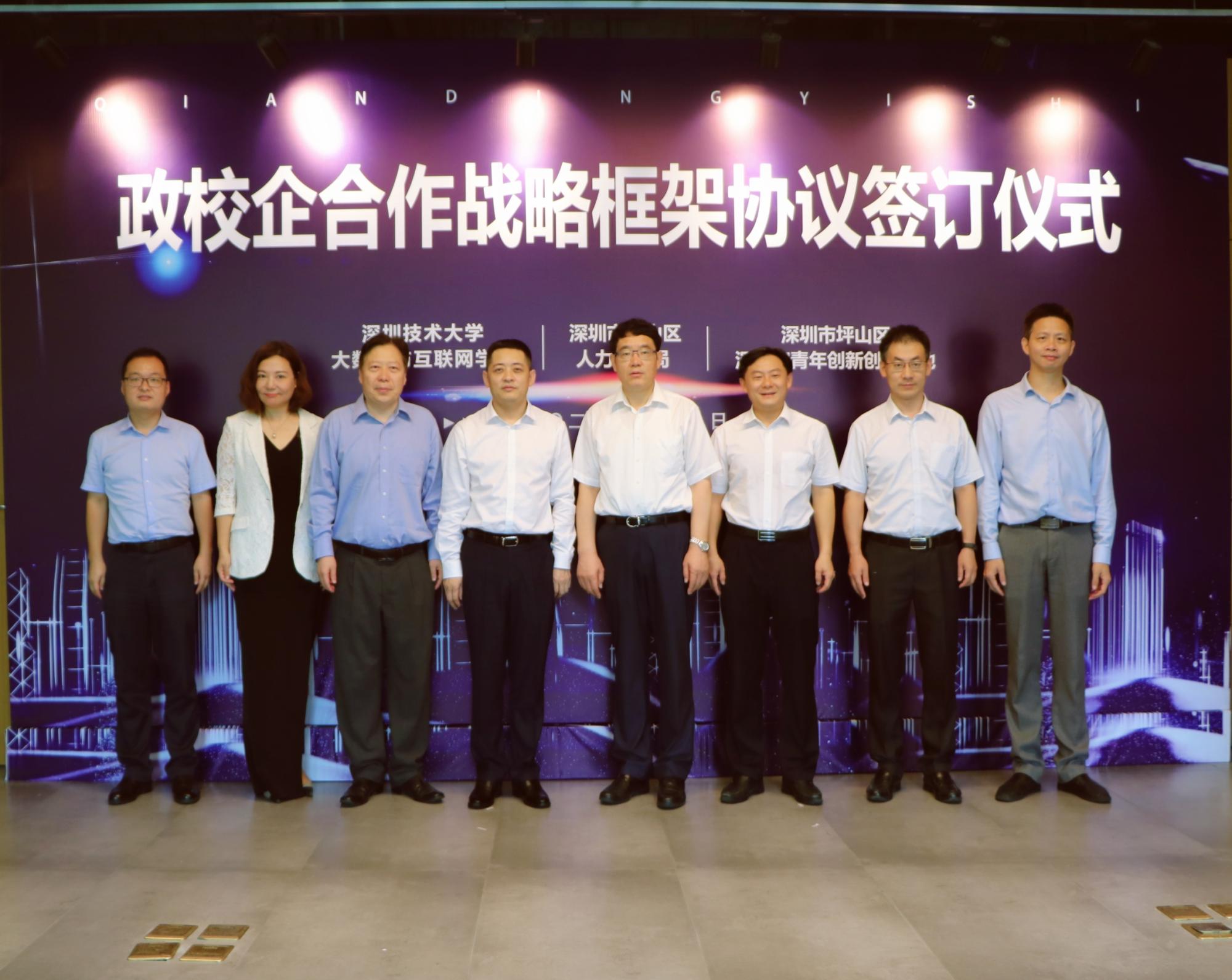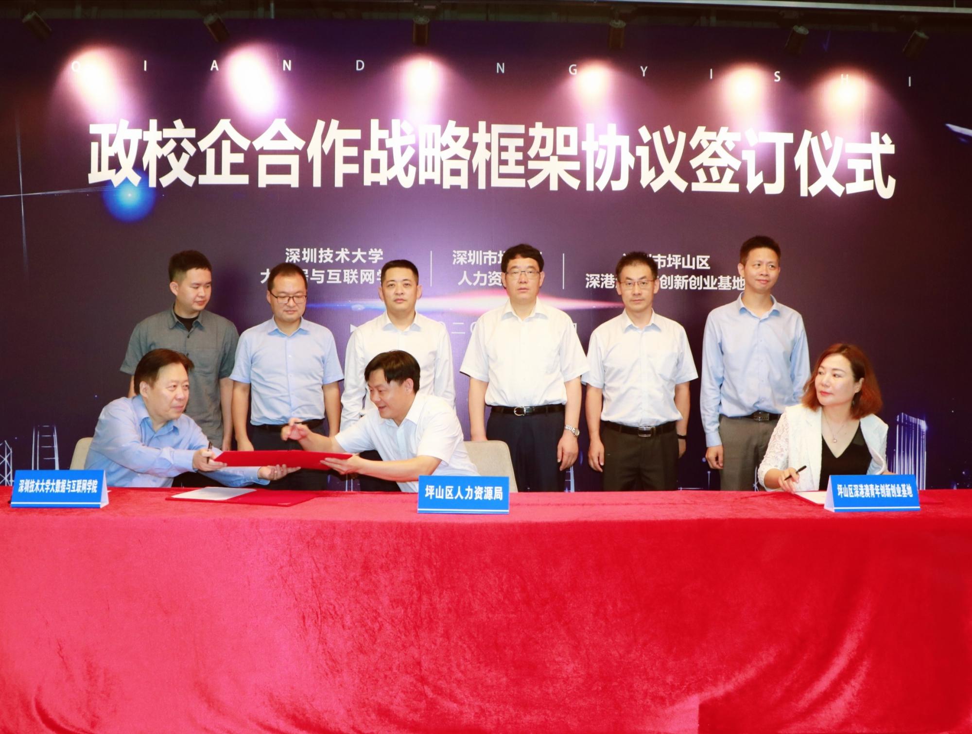 7月8日上午,欧冠官方网站入口大数据与互联网学院、坪山区人力资源局、坪山区深港澳青年创新创业基地三方共同签署战略合作框架协议,正式启动政校企合作。欧冠官方网站入口校长阮双琛,坪山区委常委、统战部部长李广明等共同出席项目签约仪式。