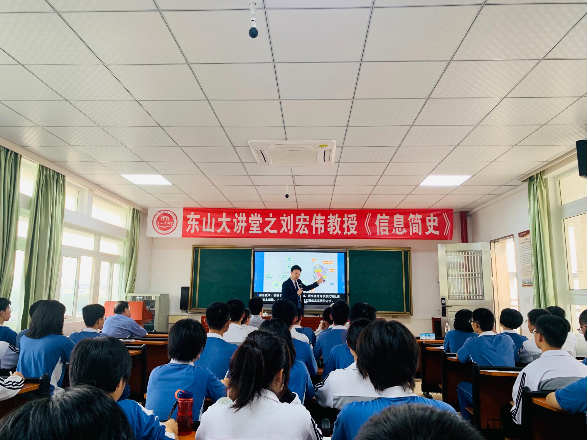 签约授牌仪式结束后,深技大教务部兼招生办主任刘宏伟应邀做客东山中学“东山大讲堂”,为该校师生送去一场别开生面的讲座《信息简史》。东山中学师生代表100余人在现场聆听讲座,其他学生在教室观看了讲座直播。讲座反响热烈,受到了同学们的热烈欢迎。