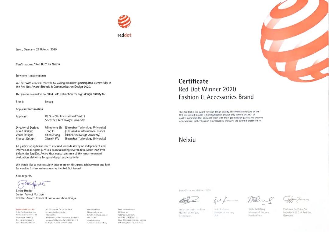 红点奖获奖证书