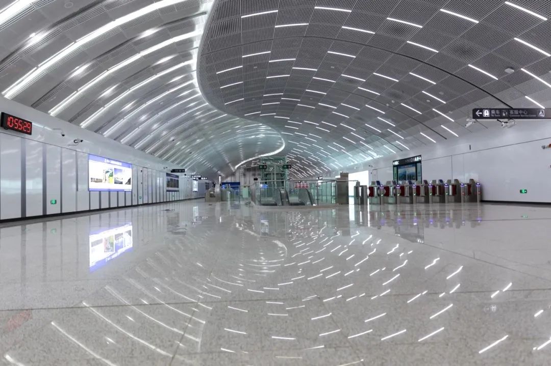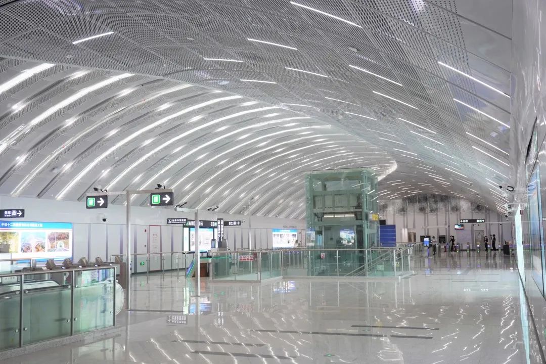 技术大学站是16号线第23座车站,也是16号线中唯二采用无柱直墙拱顶结构设计的车站。站厅公共区范围取消结构柱,以“拱”的形式进行结构设计。