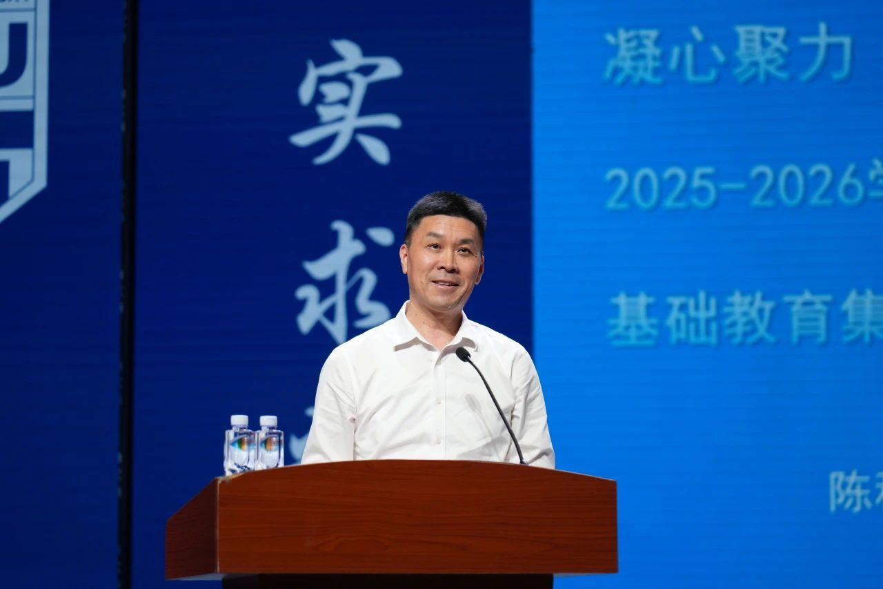 陈秋明作相关工作部署。他表示,基础教育集团要深入落实习近平总书记关于教育的重要论述,坚守立德树人根本任务,把握教育政治属性、人民属性、战略属性等三大属性,发挥思政引领力、人才竞争力、科技支撑力等六大特质,打造固本铸魂的思想政治教育体系、公平优质的基础教育体系、自强卓越的高等教育体系等八大体系,统筹支撑国家战略和满足民生需求的关系、知识学习和全面发展的关系、培养人才和满足社会需要的关系等五大关系。在讲话中,他指出了深圳思政考验、人工智能教育转型、新学校发展等现实挑战,并从推进思政教育一体化、强化集团督导、提升教学质量、加强教师队伍建设、守牢安全底线等七方面提出要求,明确大学将从人才、政策、资源上全力支持基础教育集团发展,并部署新校开学、基孔肯雅热预防及 “十五五” 发展谋划等具体工作。