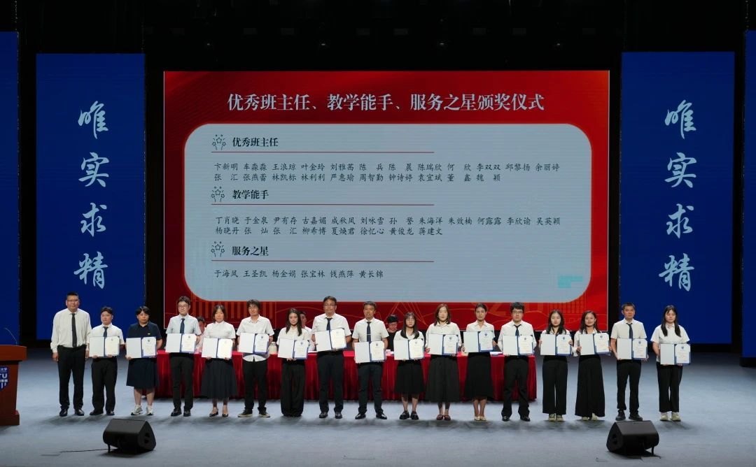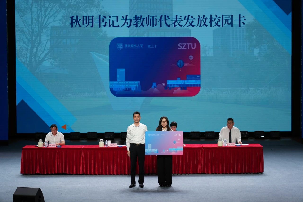 大会举行了颁奖仪式,邵爱国宣读《关于表彰优秀班主任、教学能手、服务之星的决定》,以先进典型为标杆,激励全体教职工砥砺奋进。陈秋明为基础教育集团教师发放深技大校园卡,此举打通大学资源共享通道,将高校优质资源与平台转化为集团办学的坚实后盾,为教育教学赋能。