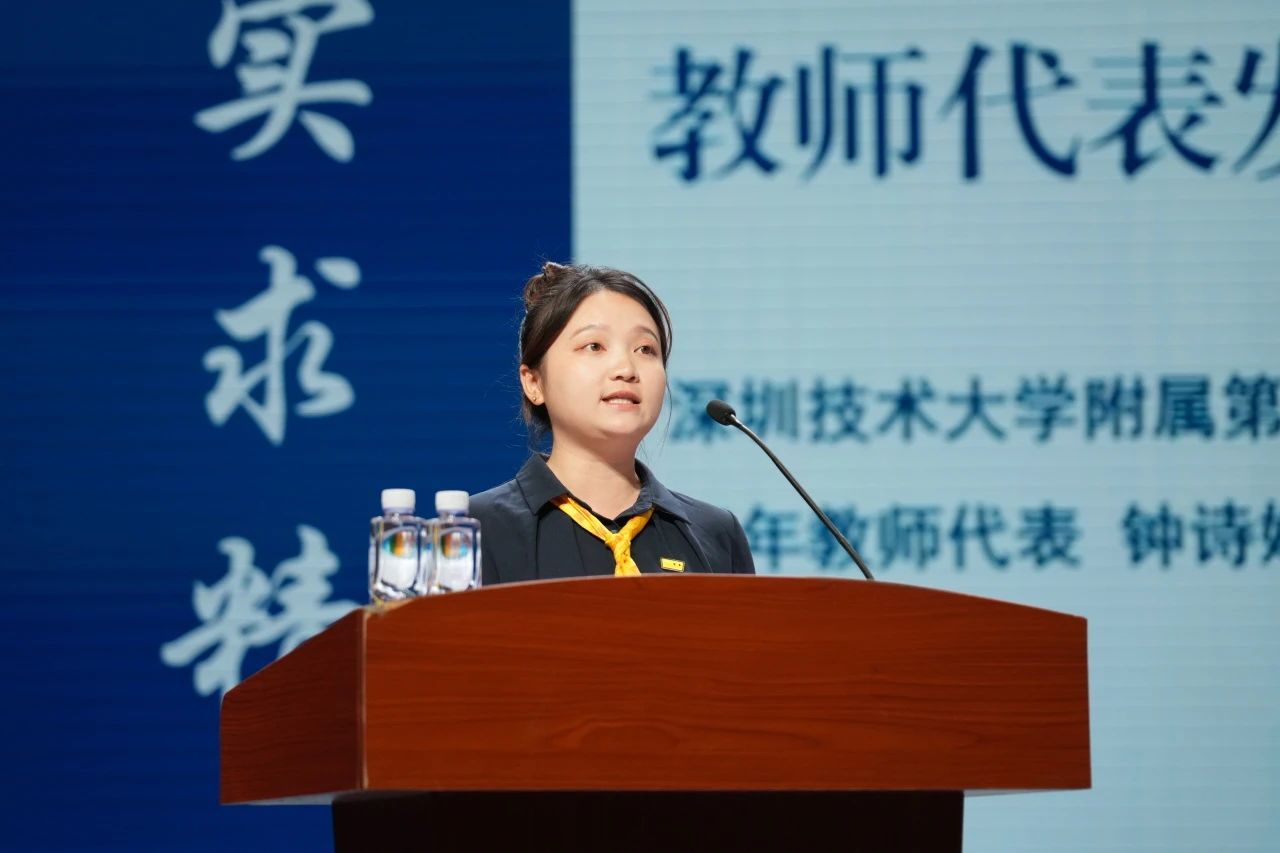各成员校(园)教师代表先后发言:附属中学高三年级主任王永彬明确2026届高三 “百尺竿头更进一步” 的成绩目标,光明学校班主任代表林丽茜回顾从 “破土摸索” 到 “奋斗创新” 的首届中考历程,附属第二幼儿园青年教师代表钟诗婷分享 “有温度的幼教” 实践,坪山实验学校新入职教师代表蔡惠庭表达扎根课堂、提升数字素养的决心,充分展现集团教师队伍的责任与担当。