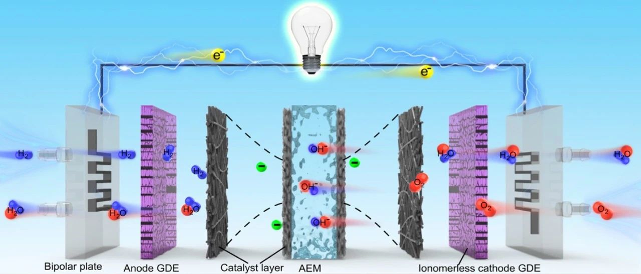 杨涛常年致力于燃料电池产业化方向的研究与应用,深知现有AEMFC技术在催化剂和电极材料方面存在的挑战。受同行启发后,他花费两年时间持续攻关非离子交联聚合物工程化技术难题,并成功将其应用于AEMFC的阴极。这一创新性的研究成果近期在国际顶级能源期刊《Joule》(影响因子39.8)上发表,题为“Anion-exchange membrane fuel cells with ionomerless cathodes”(非离子交联聚合物阴极阴离子交换膜燃料电池)。