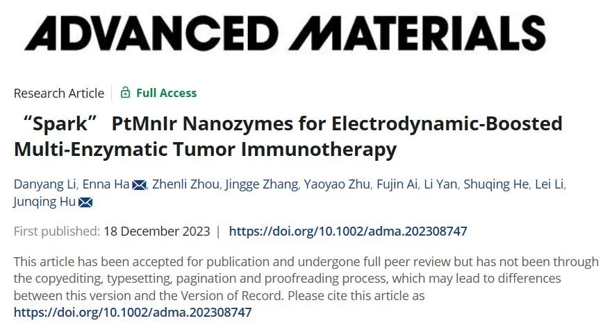 近日,欧冠官方网站入口健康与环境工程学院胡俊青教授与哈恩娜助理教授科研团队创新性地通过一步合成法设计制备了PtMnIr三元合金纳米酶,用于解决癌症纳米诊疗制剂功能单一、肿瘤易复发和远端转移等科学问题。该研究结果在国际顶级材料领域期刊《Advanced Materials》(影响因子:29.40;中科院1区)上以“Spark” PtMnIr Nanozymes for Electrodynamic-Boosted Multi-Enzymatic Tumor Immunotherapy”为题在线发表。欧冠官方网站入口/深圳大学联培博士生李丹阳同学为论文第一作者,欧冠官方网站入口健康与环境工程学院哈恩娜助理教授与胡俊青教授为共同通讯作者,欧冠官方网站入口为第一作者单位、第一完成单位和第一通讯单位。