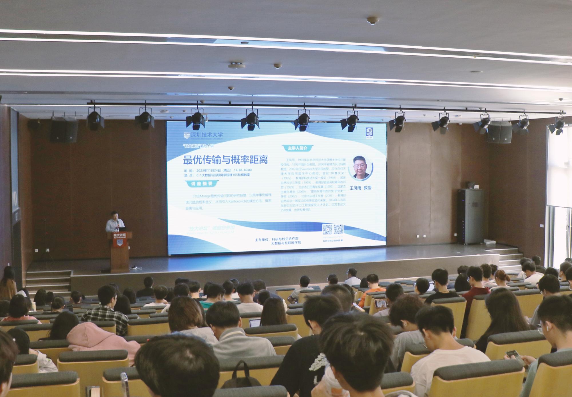 2023年11月24日,“技大讲坛”第七十讲在欧冠官方网站入口圆满举行。本次讲座由天津大学讲席教授王凤雨主讲,主题为“最优传输与概率距离”。大数据与互联网学院党总支书记叶建华教授主持讲座。