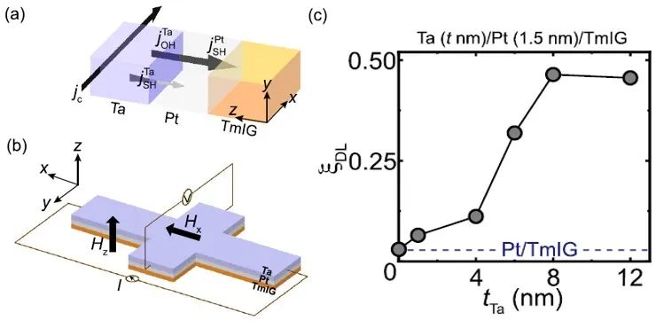 图|(a) Ta/Pt/TmIG异质结中自旋流和轨道流的产生和输运示意图。