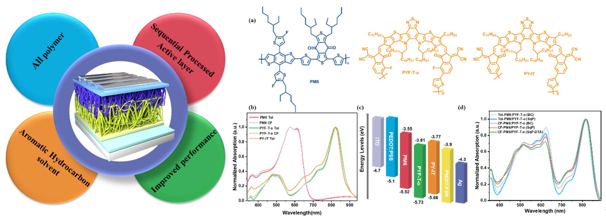 我校新能源与新材料学院张光烨助理教授团队首次通过逐层制备(SqP)方法并使用甲苯作为溶剂制备全聚合物太阳能电池,这有效地提高了电子迁移率,解决了PSMA基全聚合物太阳能电池中电子迁移率普遍偏低的难题,并制备出发表该论文时该方法的最高光电转化效率(15.8%)。该项工作还首次利用原位UV-Vis技术揭示了逐层制备方法制备全聚合物活性层的成膜过程,并且通过研究动态薄膜厚度的吸收光谱法研究整个器件的垂直相分离和激子生成率,这系统地解释了器件垂直形貌对器件参数的影响。