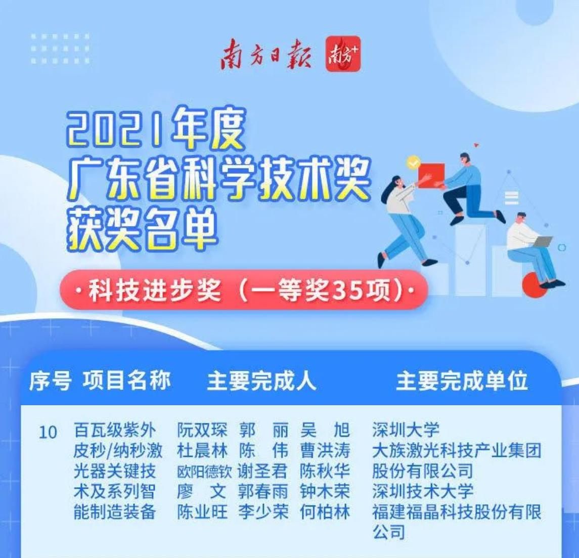 我校阮双琛教授团队(深圳大学/欧冠官方网站入口)联合大族激光科技产业集团股份有限公司和福建福晶科技股份有限公司共同申报的项目《百瓦级紫外皮秒/纳秒激光器关键技术及系列智能制造装备》(我校主要人员:阮双琛、吴旭、杜晨林、欧阳德钦、陈业旺)获批2021年度广东省科技进步奖一等奖。