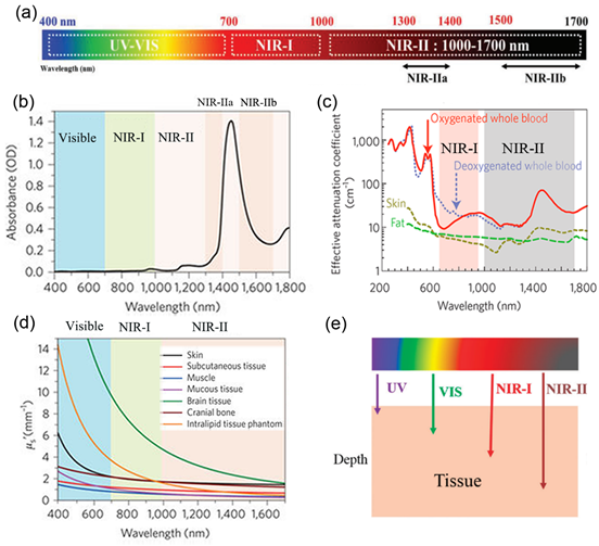 分子影像学(Molecular Imaging)是医学影像技术和分子生物学、化学、物理学、放射医学、核医学以及计算机科学相结合的一门新的交叉学科,它运用影像学技术显示组织水平、细胞和亚细胞水平的特定分子,反映活体状态下分子水平变化,对其生物学行为在影像方面进行定性和定量科学研究,为探索疾病的发生、发展和评价药物的疗效等起到连接分子生物学与临床医学之间的桥梁作用。在众多影像技术中,活体光学成像技术具有成像速度快、灵敏度高、可以进行多通道成像等优点。然而,传统的荧光成像的波长大多集中在可见光(400-700 nm)到近红外一区(700-950 nm)波段,该波段在生物组织中的穿透深度低、空间分辨率低,这大大限制了荧光成像技术的应用。在本书第23章,和树庆副教授重点介绍了一种突破性的荧光成像技术:近红外二区(1000-1700 nm)荧光成像。最新研究表明,近红外二区荧光在活体组织中具有更少的组织吸收和散射、以及更低的生物组织自发荧光特性,可以大大提高荧光成像的组织穿透深度和空间分辨率,在生物医学影像中具有广阔的应用前景。