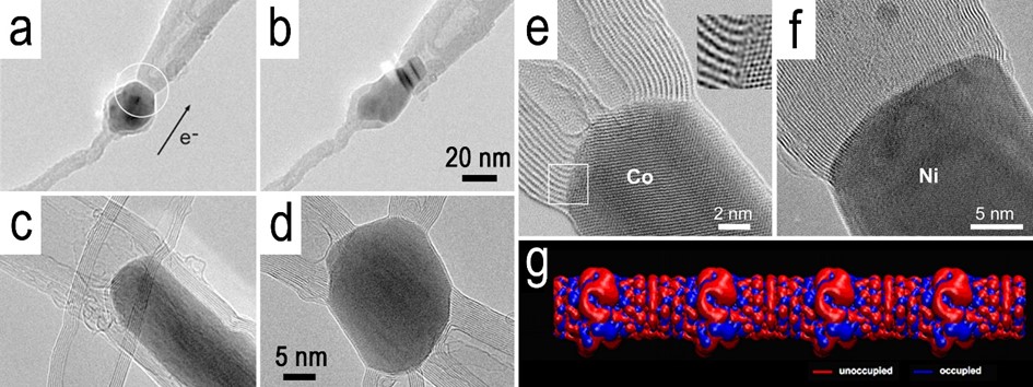 图1. TEM下电子束辐照技术实现Co纳米颗粒共催化修复和连接多壁碳纳米管。