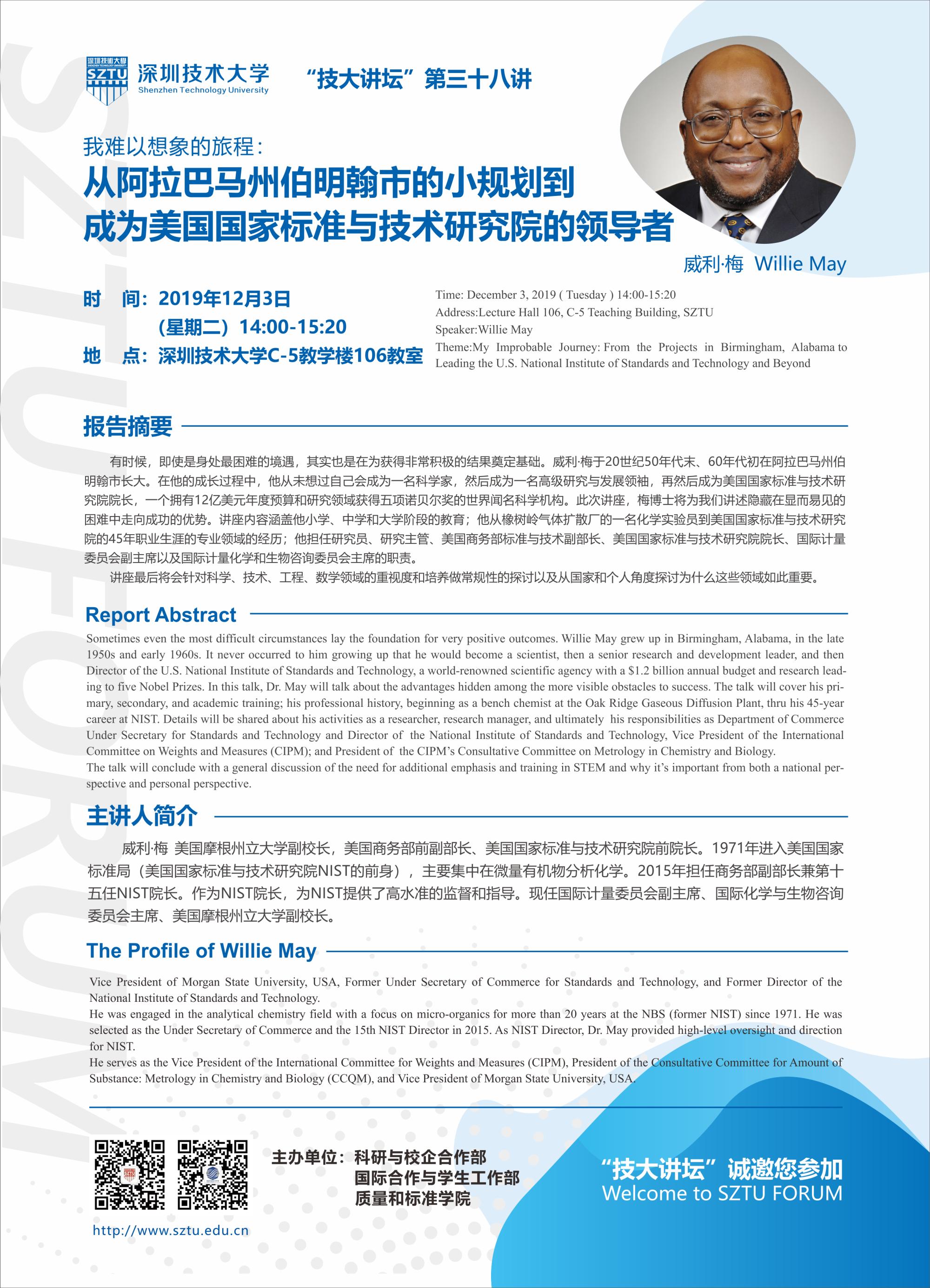 有时候,即使是身处最困难的境遇,其实也是在为获得非常积极的结果奠定基础。威利·梅于20世纪50年代末、60年代初在阿拉巴马州伯明翰市长大。在他的成长过程中,他从未想过自己会成为一名科学家、然后成为一名高级研究与发展领袖,再然后成为美国国家标准与技术研究院院长,一个拥有12亿美元年度预算和研究领域获得五项诺贝尔奖的世界闻名科学机构。此次讲座,梅博士将为我们讲述隐藏在显而易见的困难中走向成功的优势。讲座内容涵盖他小学、中学和大学阶段的教育;他从橡树岭气体扩散厂的一名化学实验员到美国国家标准与技术研究院的45年职业生涯的专业领域的经历;他担任研究员、研究主管、美国商务部标准与技术副部长、美国国家标准与技术研究院院长、国际计量委员会副主席以及国际计量化学和生物咨询委员会主席的职责。
