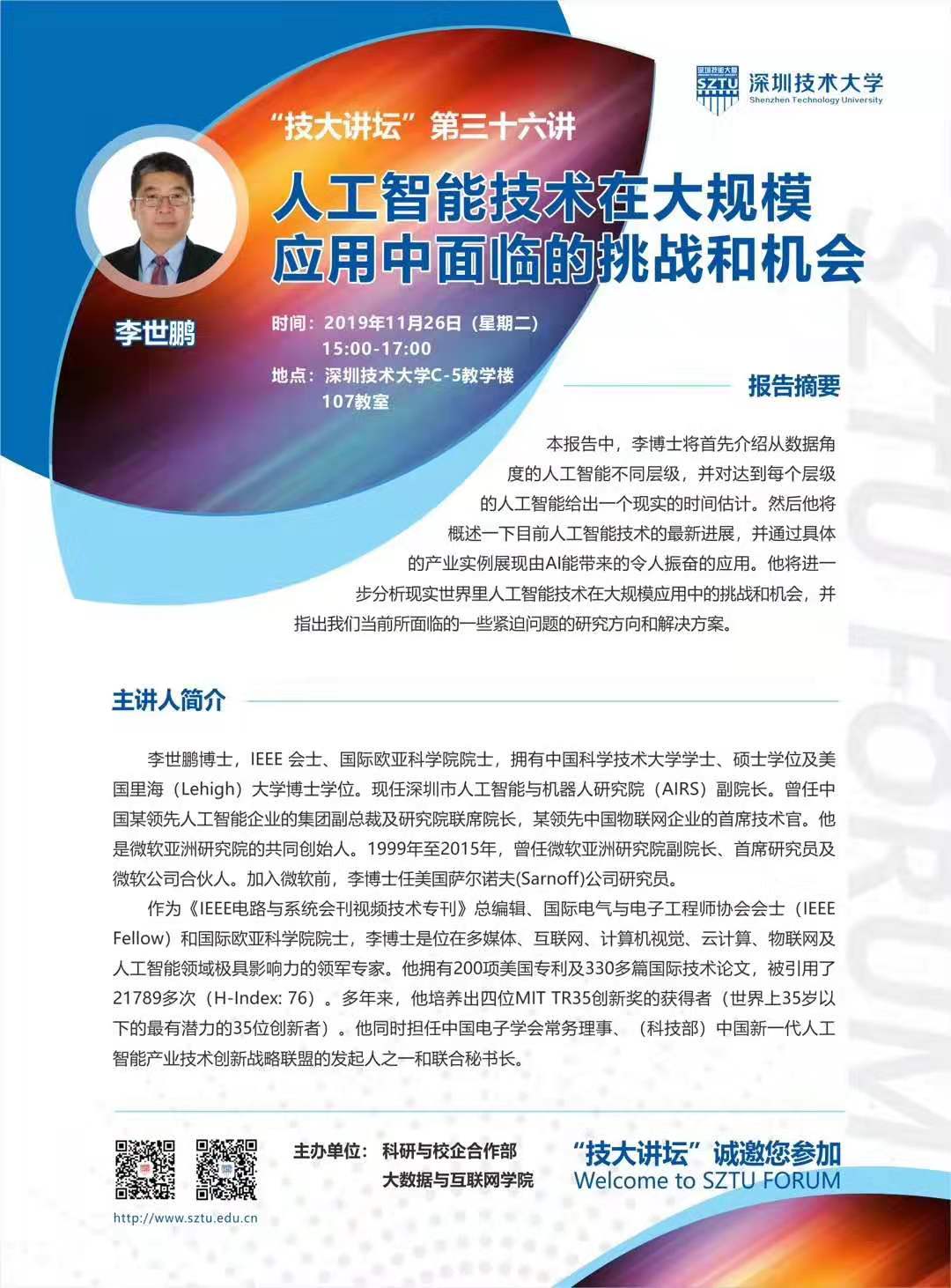 李世鹏博士,IEEE会士、国际欧亚科学院院士,拥有中国科学技术大学学士、硕士学位及美国里海(Lehigh)大学博士学位。现任深圳市人工智能与机器人研究院(AIRS)副院长。曾任中国某领先人工智能企业的集团副总裁及研究院联席院长,某领先中国物联网企业的首席技术官。他是微软亚洲研究院的共同创始人。1999年至2015年,曾任微软亚洲研究院副院长、首席研究员及微软公司合伙人。加入微软前,李博士任美国萨尔诺夫(Sarnoff)公司研究员。