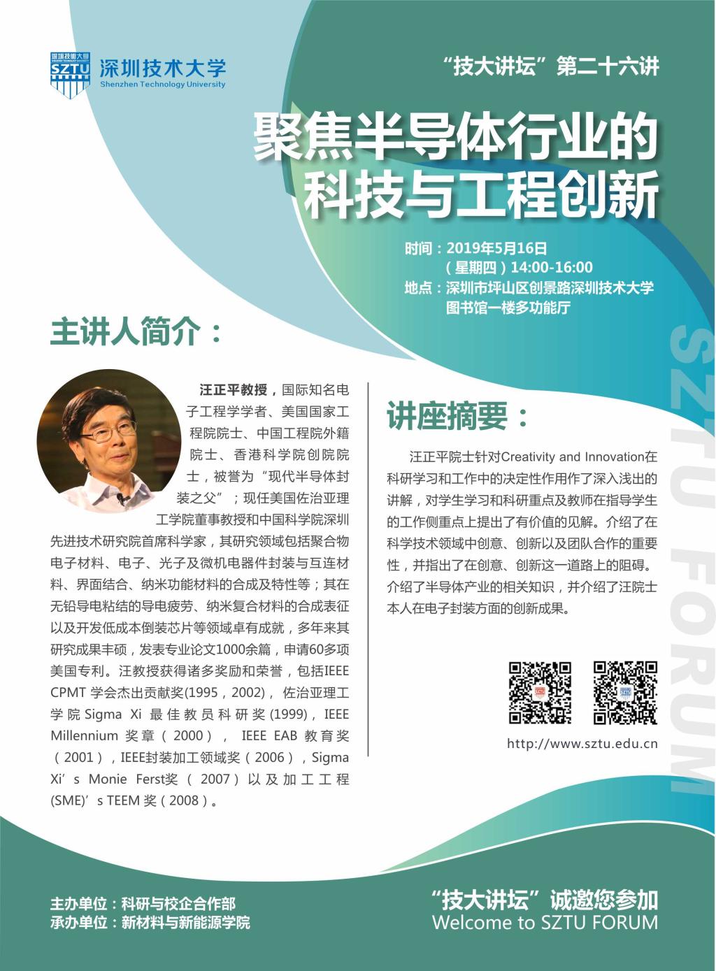 汪正平教授,国际知名电子工程学学者、美国国家工程院院士、中国工程院外籍院士、香港科学院创院院士,被誉为“现代半导体封装之父”;现任美国佐治亚理工学院董事教授和中国科学院深圳先进技术研究院首席科学家,其研究领域包括聚合物电子材料、电子、光子及微机电器件封装与互连材料、界面结合、纳米功能材料的合成及特性等;其在无铅导电粘结的导电疲劳、纳米复合材料的合成表征以及开发低成本倒装芯片等领域卓有成就,多年来其研究成果丰硕,发表专业论文1000余篇,申请60多项美国专利。汪教授获得诸多奖励和荣誉,包括IEEE CPMT学会杰出贡献奖(1995,2002),佐治亚理工学院Sigma Xi最佳教员科研奖(1999),IEEE Millennium奖章(2000),IEEE EAB教育奖(2001),IEEE封装加工领域奖(2006),Sigma Xi’s Monie Ferst奖(2007)以及加工工程(SME)’s TEEM奖(2008)。