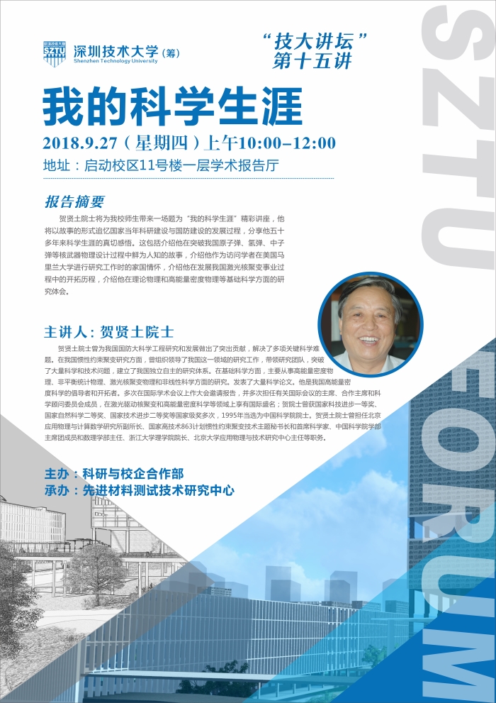 9月27日,中国科学院院士、著名理论物理学家、欧冠官方网站入口(筹)客座教授贺贤土应邀做客“技大讲坛”,带来一场题为“我的科学生涯”的精彩讲座。欧冠官方网站入口(筹)主任阮双琛、中国科学院院士罗民兴及深技大师生参加了这一讲座,讲座由深技大副主任徐刚主持。欧冠官方网站入口(筹)主任阮双琛对贺贤土院士莅临表示感谢,勉励在场学生学习老一辈科学家执着追求的科学探索精神。