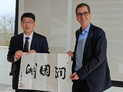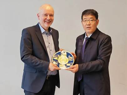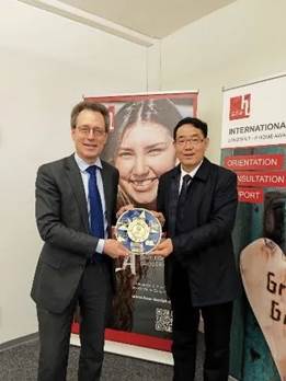 阮双琛向东巴伐利亚应用技术大学(雷根斯堡)校长Ralph Schneider(右)赠送礼物