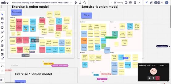 何欣洋:非常感谢学校给我们提供这样一个国际交流的机会,这场持续四个半小时的线上workshop对我来说非常有趣也非常具有挑战性。使用miro白板进行互动也很有意思,通过洋葱模型我了解到中国德国和比利时三个国家在象征物、英雄人物性格、礼仪以及价值观上的共通与差异。德国人说话相较中国人更为直接,我们也尝试用委婉的语气“改写”一些直接的表达。最具挑战性的是商务谈判的角色扮演环节,在这场谈判中我深刻感受到中德文化差异。德国小伙伴们非常像一个专业团队,非常严谨且直奔主题——签合同,而她,他们对我们发出的共进晚餐的邀请却不太感兴趣。这场国际课程让我对中德文化差异,以及在跨文化环境中工作需要考虑的因素有了更深刻的理解,更棒的是有幸见到了可爱的德国朋友们!希望学校以后能开设更多相关的国际课程!