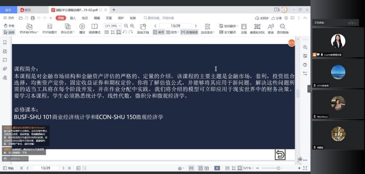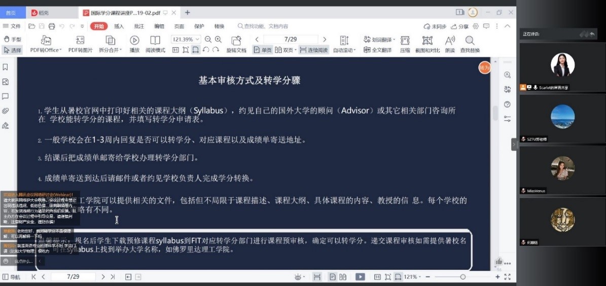 此次线上讲座上,项目承办方负责人管艺琨介绍了佛罗里达理工学院概况、国际学分课程优势、申请流程、转学分事宜、课程内容、授课教授等详情,并解答了学生咨询的问题。此项目将为深技大学子提供多门由两校联合开设的国际课程,并邀请国际教授授课,学生顺利通过课程考核可获得佛罗里达理工学院的相应学分,并有机会获得名企实习内推、国际教授推荐信、学费补贴等。