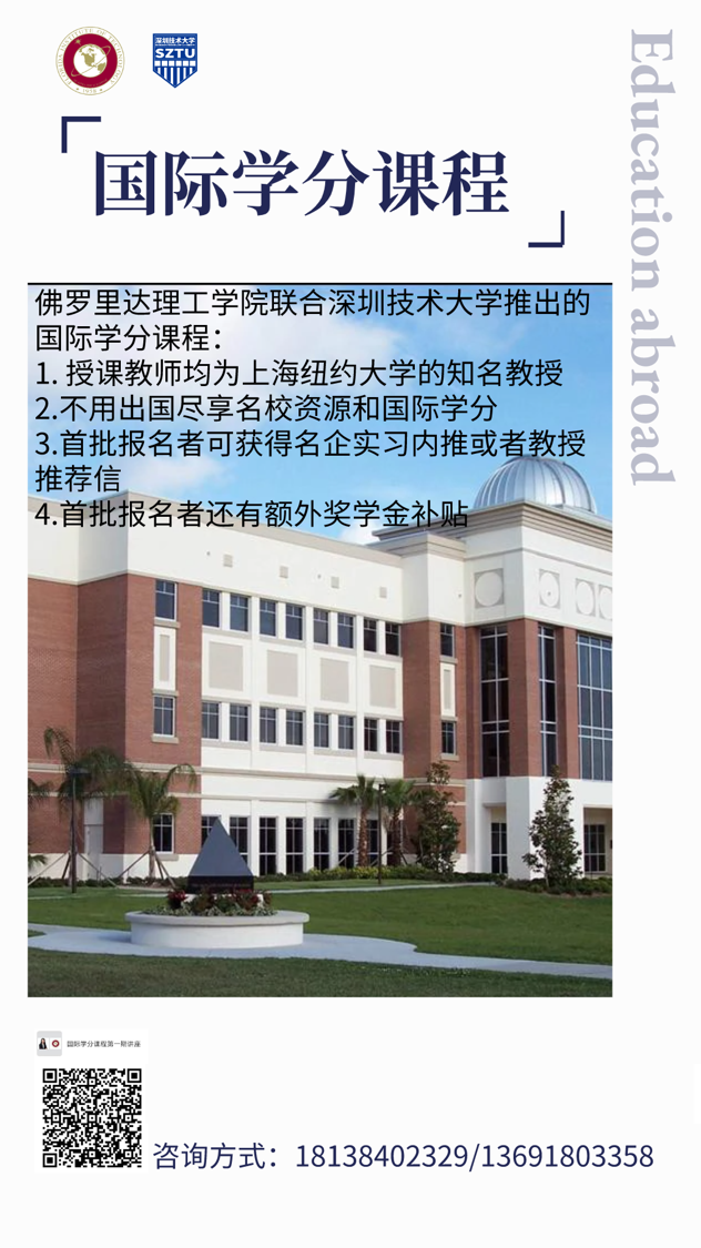 欧冠官方网站入口与佛罗里达理工学院联合国际学分课程正开放申请,后续将根据疫情防控及报名情况择期有序开课。感兴趣的同学可通过海报上联系方式进行咨询。