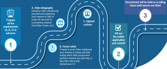2、英文申请信:准备一封表述你对迪拜和DBA项目意向的500字申请信,写明DBA项目的哪一个合作伙伴吸引了你,并阐述原因;