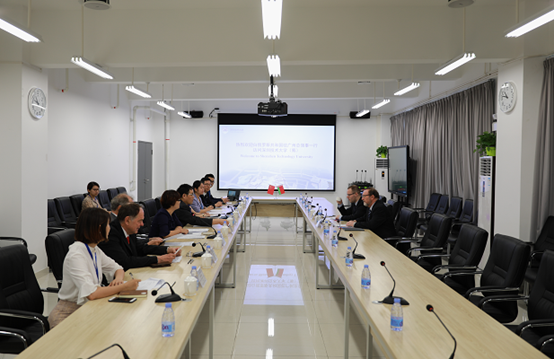 深技大阮双琛主任,孙乡瑜副主任,特聘教授、商学院院长霍尔格·哈顿旺教授,特聘教授、城市交通与物流学院院长付朗兹·拉普斯教授,中德智能制造学院副院长王红志教授,国际合作与学生工作部负责人曾思予女士及相关工作人员与来宾进行了会谈。