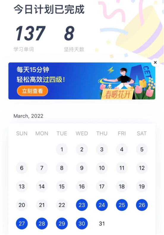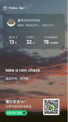 14天的打卡活动下来,我感受到每天提前设置好一个小目标有多么重要。比如说,我的打卡形式大多是背单词,但是之前对自己没有要求的话,可能一天背一几二十几个单词就凑合过去了。但是有了目标之后,即便每一天都要复习之前学习过的数百个单词,我也都会坚持背到40个新单词。就算没有动力背单词了,我也会选择运动,或者读一些书籍来充实自己。总而言之,此次活动我最大的感触就是每天提前设置好一个小目标可以让自己过得更加充实,而完成这个小目标也会让我更有动力去做其他更有难度的任务。