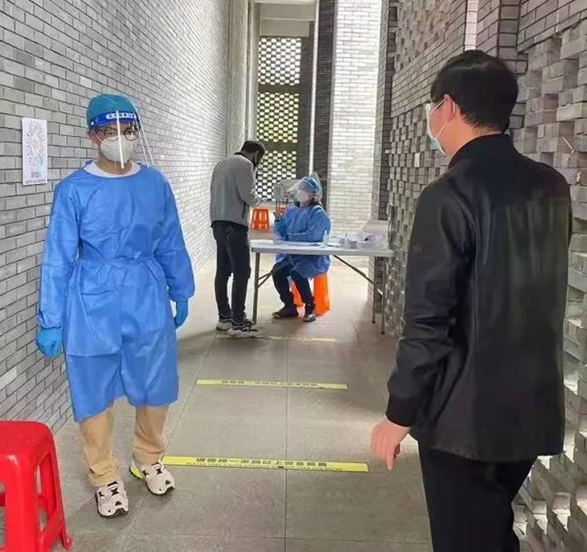 同在深圳,本该前往企业实习的他,也加入了义工队伍,在社区逐层逐户敲门通知业主下楼做核酸。